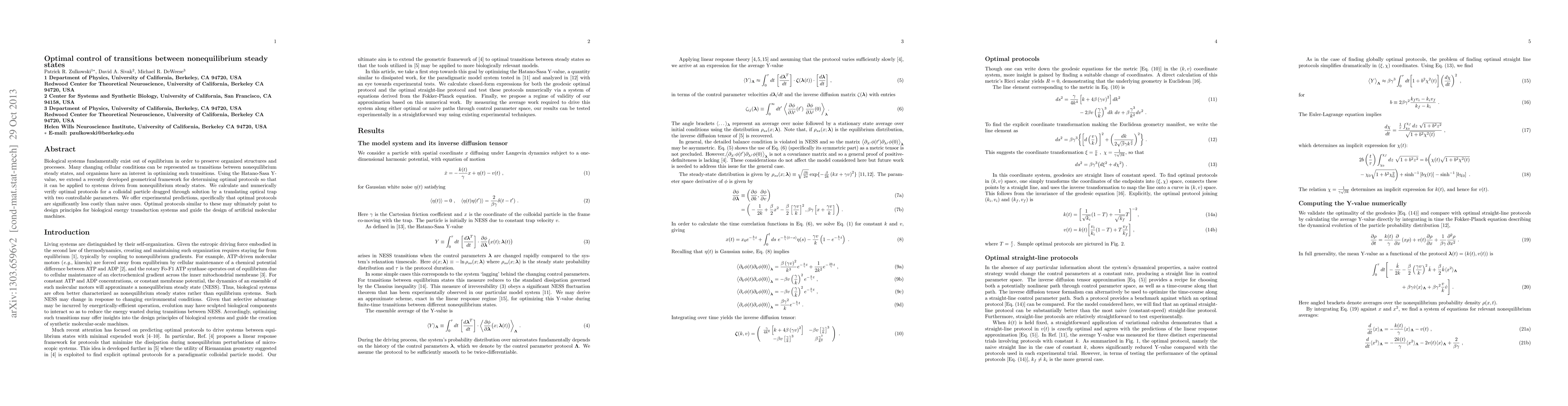 This paper extends a geometrical framework to determine optimal control protocols for transitions between nonequilibrium steady states in biological systems, applying it to a colloidal particle in an optical trap. The study finds that optimal protocols are significantly less costly than naive methods, offering insights into biological energy transduction and artificial molecular machines.