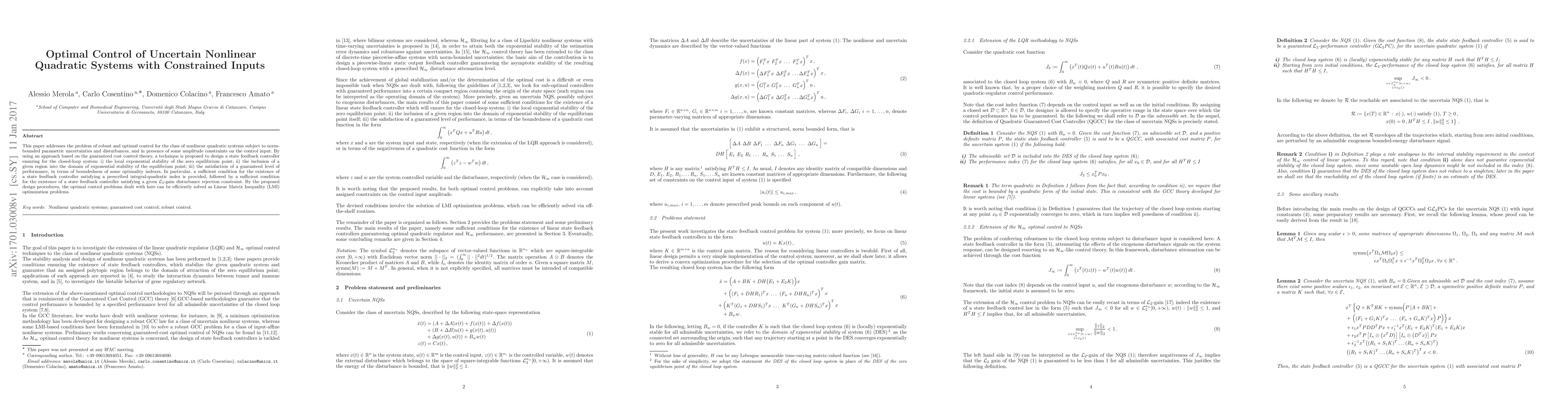 This paper proposes a guaranteed cost control method for optimal control of uncertain nonlinear quadratic systems with constrained inputs, ensuring stability, performance, and disturbance rejection through LMI optimization. The approach provides sufficient conditions for designing state feedback controllers that meet prescribed integral-quadratic and $\mathcal L_2$-gain constraints.