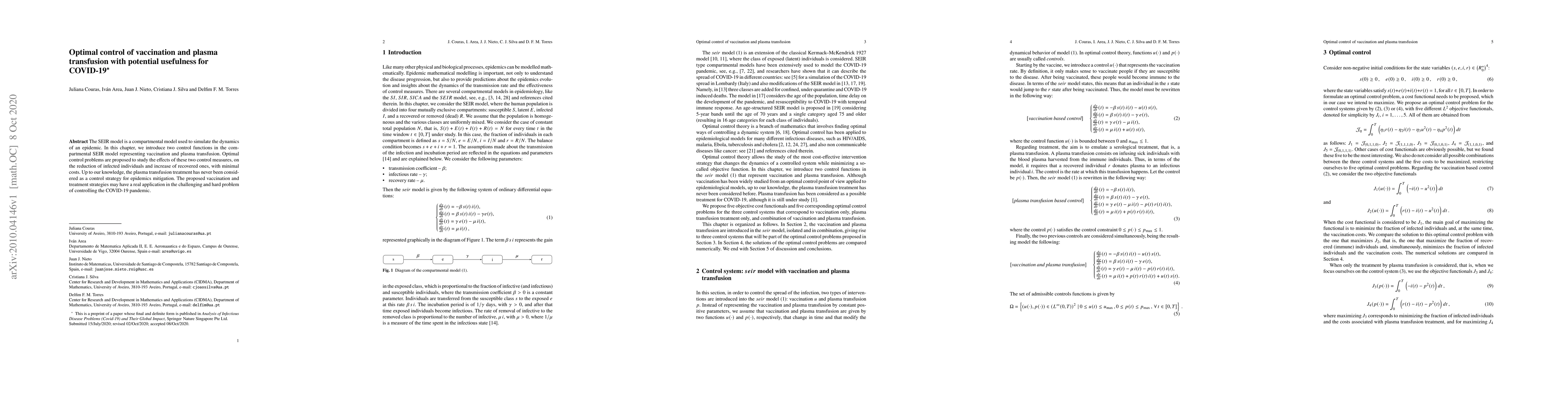 The SEIR model is a compartmental model used to simulate the dynamics of an epidemic. In this chapter, we introduce two control functions in the compartmental SEIR model representing vaccination and plasma transfusion. Optimal control problems are proposed to study the effects of these two control measures, on the reduction of infected individuals and increase of recovered ones, with minimal costs. Up to our knowledge, the plasma transfusion treatment has never been considered as a control strategy for epidemics mitigation. The proposed vaccination and treatment strategies may have a real application in the challenging and hard problem of controlling the COVID-19 pandemic.