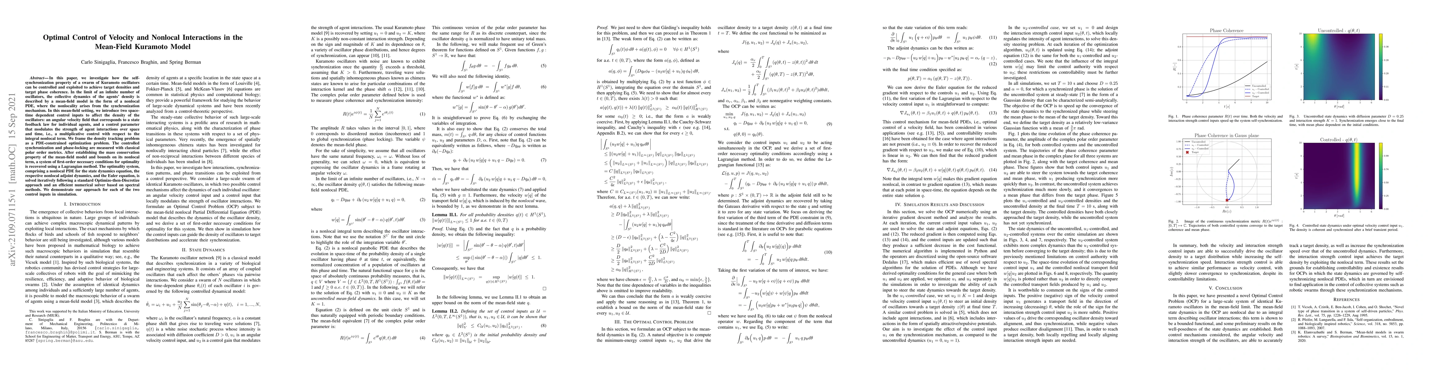 In this paper, we investigate how the self-synchronization property of a swarm of Kuramoto oscillators can be controlled and exploited to achieve target densities and target phase coherence. In the limit of an infinite number of oscillators, the collective dynamics of the agents' density is described by a mean-field model in the form of a nonlocal PDE, where the nonlocality arises from the synchronization mechanism. In this mean-field setting, we introduce two space-time dependent control inputs to affect the density of the oscillators: an angular velocity field that corresponds to a state feedback law for individual agents, and a control parameter that modulates the strength of agent interactions over space and time, i.e., a multiplicative control with respect to the integral nonlocal term. We frame the density tracking problem as a PDE-constrained optimization problem. The controlled synchronization and phase-locking are measured with classical polar order metrics. After establishing the mass conservation property of the mean-field model and bounds on its nonlocal term, a system of first-order necessary conditions for optimality is recovered using a Lagrangian method. The optimality system, comprising a nonlocal PDE for the state dynamics equation, the respective nonlocal adjoint dynamics, and the Euler equation, is solved iteratively following a standard Optimize-then-Discretize approach and an efficient numerical solver based on spectral methods. We demonstrate our approach for each of the two control inputs in simulation.