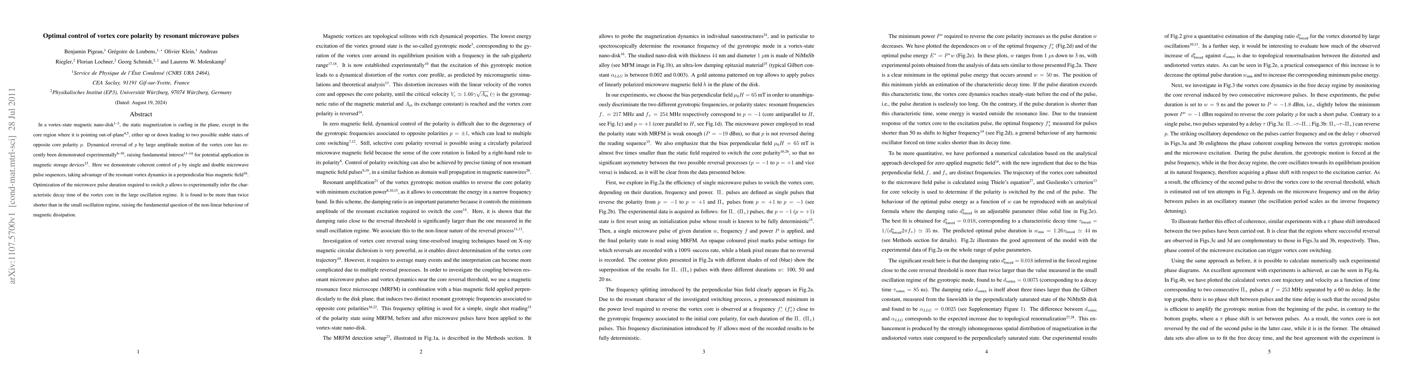 This paper demonstrates the coherent control of vortex core polarity in magnetic nano-disks using resonant microwave pulses, optimizing pulse duration to switch polarity and revealing a shorter decay time in large oscillation regimes, which challenges the understanding of magnetic dissipation's non-linear behavior.
