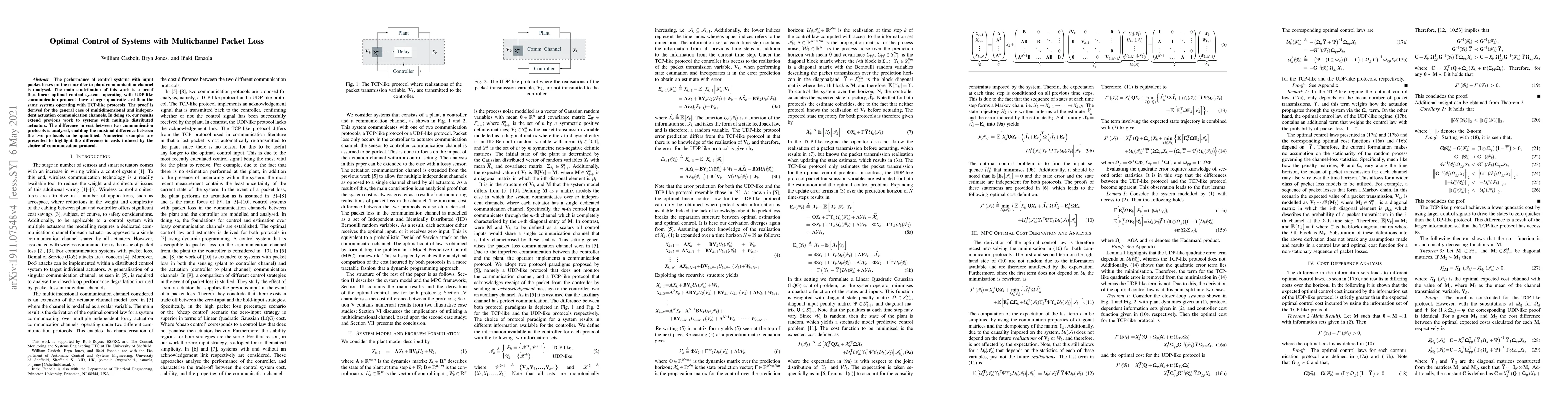 This paper analyzes control systems with packet losses in communication channels, proving that linear optimal control systems using UDP protocols incur higher quadratic costs than those using TCP protocols. The findings extend to systems with multiple distributed actuators, quantifying the cost difference between the two protocols and providing numerical examples to illustrate the impact.