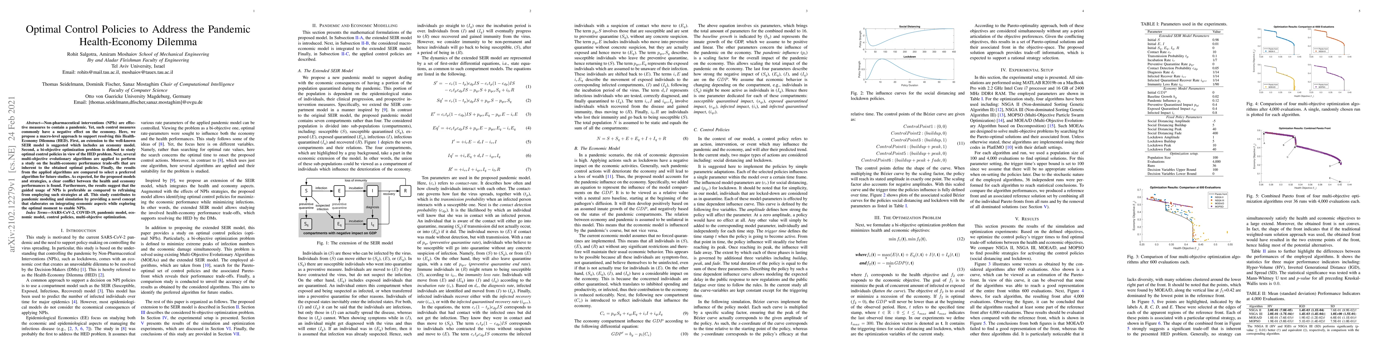 Non-pharmaceutical interventions (NPIs) are effective measures to contain a pandemic. Yet, such control measures commonly have a negative effect on the economy. Here, we propose a macro-level approach to support resolving this Health-Economy Dilemma (HED). First, an extension to the well-known SEIR model is suggested which includes an economy model. Second, a bi-objective optimization problem is defined to study optimal control policies in view of the HED problem. Next, several multi-objective evolutionary algorithms are applied to perform a study on the health-economy performance trade-offs that are inherent to the obtained optimal policies. Finally, the results from the applied algorithms are compared to select a preferred algorithm for future studies. As expected, for the proposed models and strategies, a clear conflict between the health and economy performances is found. Furthermore, the results suggest that the guided usage of NPIs is preferable as compared to refraining from employing such strategies at all. This study contributes to pandemic modeling and simulation by providing a novel concept that elaborates on integrating economic aspects while exploring the optimal moment to enable NPIs.
