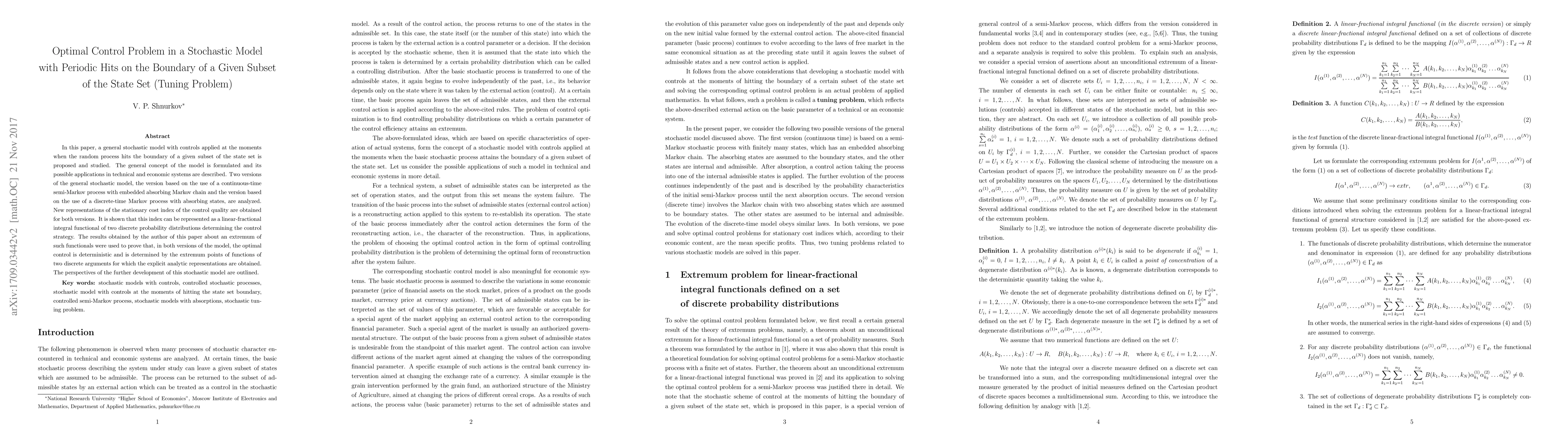 In this paper, a general stochastic model with controls applied at the moments when the random process hits the boundary of a given subset of the state set is proposed and studied. The general concept of the model is formulated and its possible applications in technical and economic systems are described. Two versions of the general stochastic model, the version based on the use of a continuous-time semi-Markov process with embedded absorbing Markov chain and the version based on the use of a discrete-time Markov process with absorbing states, are analyzed. New representations of the stationary cost index of the control quality are obtained for both versions. It is shown that this index can be represented as a linear-fractional integral functional of two discrete probability distributions determining the control strategy. The results obtained by the author of this paper about an extremum of such functionals were used to prove that, in both versions of the model, the control is deterministic and is determined by the extremum points of functions of two discrete arguments for which the explicit analytic representations are obtained. The perspectives of the further development of this stochastic model are outlined.