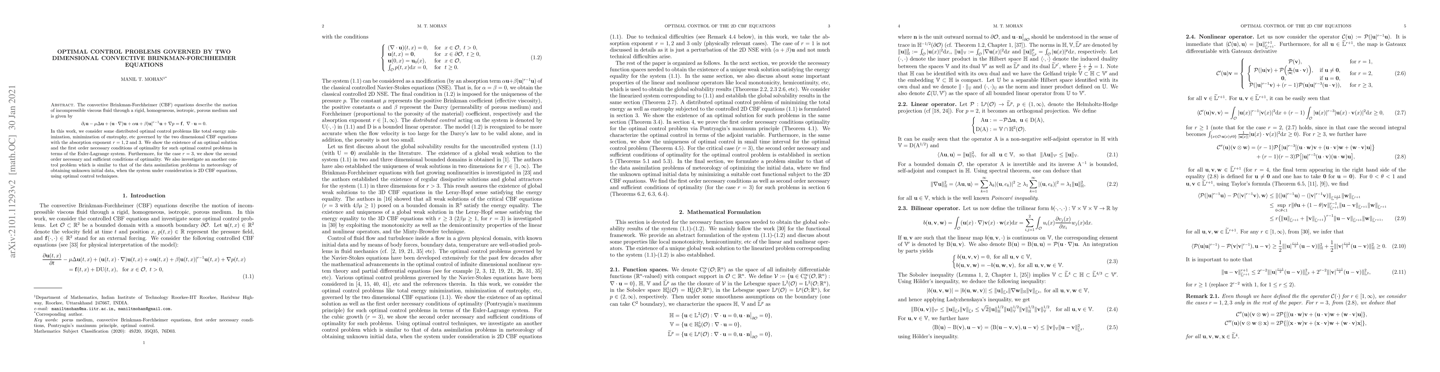 This paper investigates optimal control problems governed by two-dimensional convective Brinkman-Forchheimer equations, focusing on minimizing total energy and enstrophy. The study establishes the existence of optimal solutions and derives first-order necessary conditions, along with second-order conditions for $r=3$. It also explores data assimilation for initial data recovery using optimal control techniques.