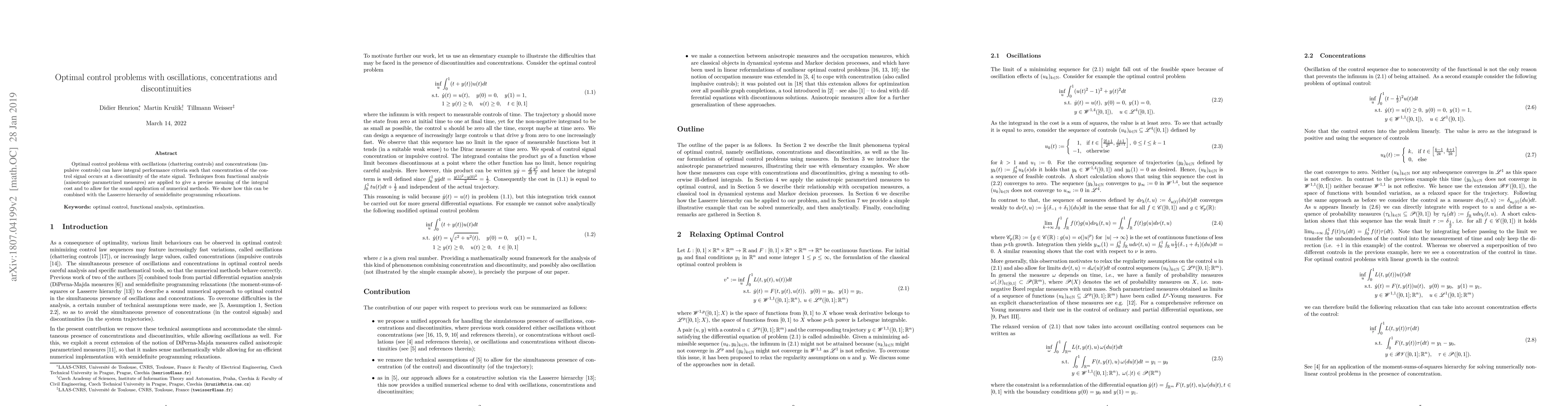 This paper addresses optimal control problems involving oscillations and concentrations, employing functional analysis techniques to define integral cost and apply numerical methods. It integrates these methods with the Lasserre hierarchy for semidefinite programming relaxations to handle complex control scenarios.