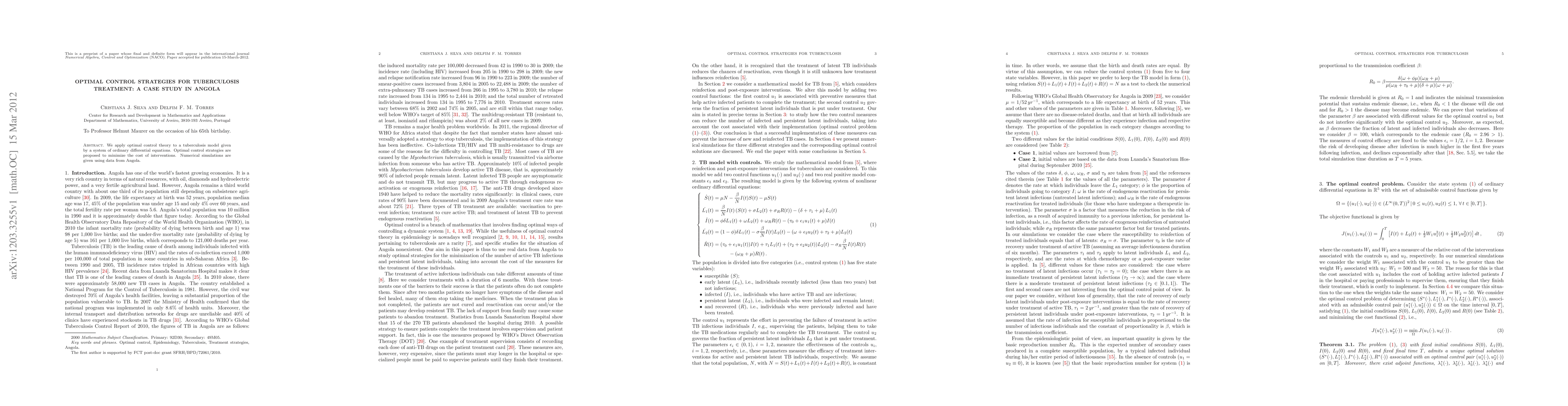 Summary: This study employs optimal control theory to develop strategies minimizing the cost of tuberculosis interventions in Angola, utilizing a mathematical model represented by ordinary differential equations and supported by local data. Numerical simulations validate the effectiveness of proposed control measures.