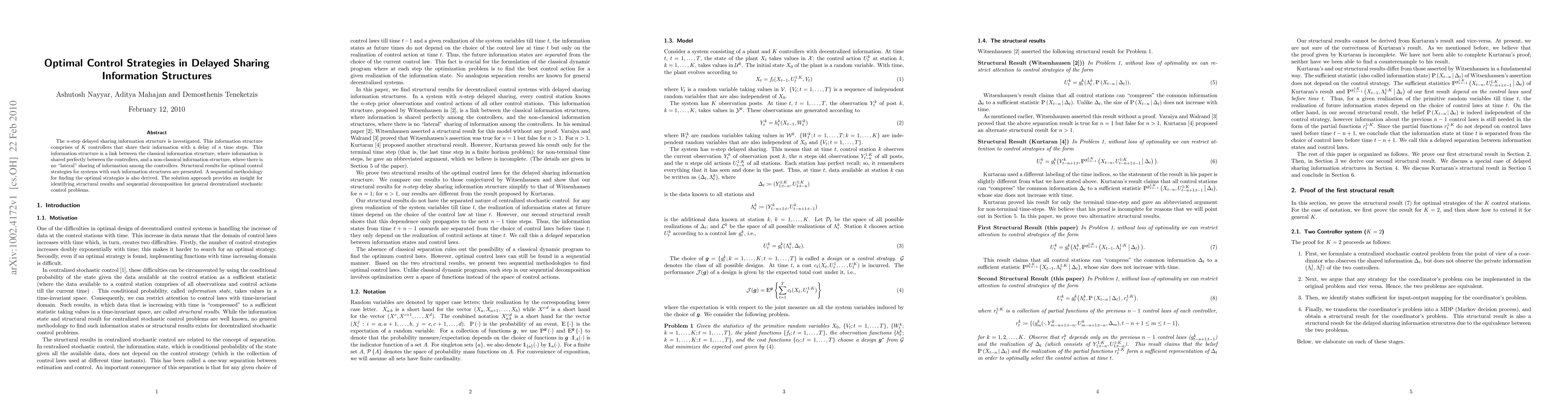 This paper explores optimal control strategies in $n$-step delayed sharing information structures, where $K$ controllers share information with an $n$ time step delay. It presents structural results and a sequential methodology for determining optimal strategies, offering insights for general decentralized stochastic control problems.