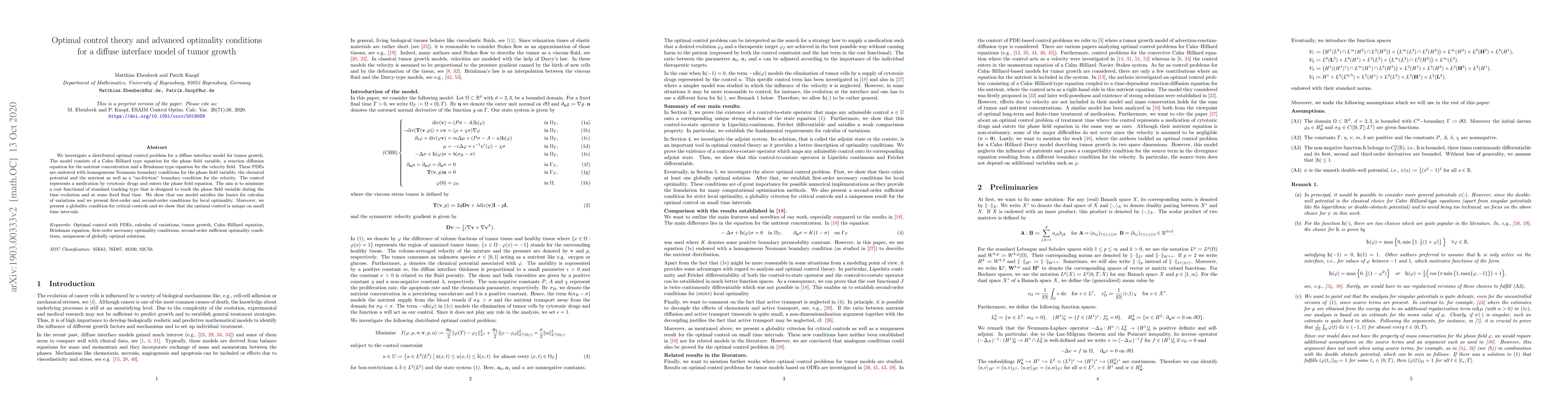 This paper investigates optimal control for a diffuse interface model of tumor growth, incorporating a Cahn-Hilliard equation, reaction diffusion equation, and Brinkman equation. It establishes first-order and second-order optimality conditions and proves the uniqueness of the optimal control on small time intervals.