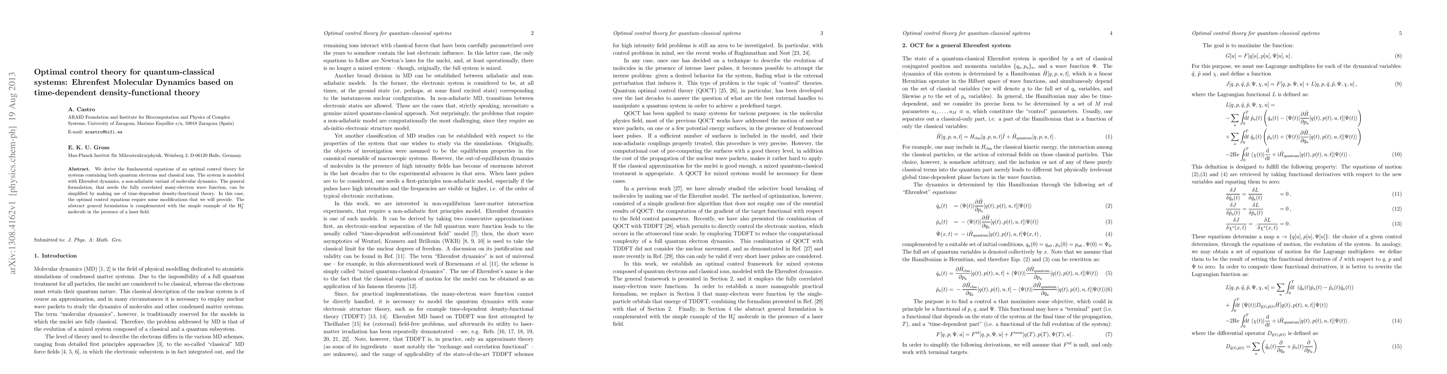 This paper develops optimal control theory for quantum-classical systems using Ehrenfest molecular dynamics, simplified via time-dependent density-functional theory. The modified optimal control equations are demonstrated through the H$_2^+$ molecule in a laser field.