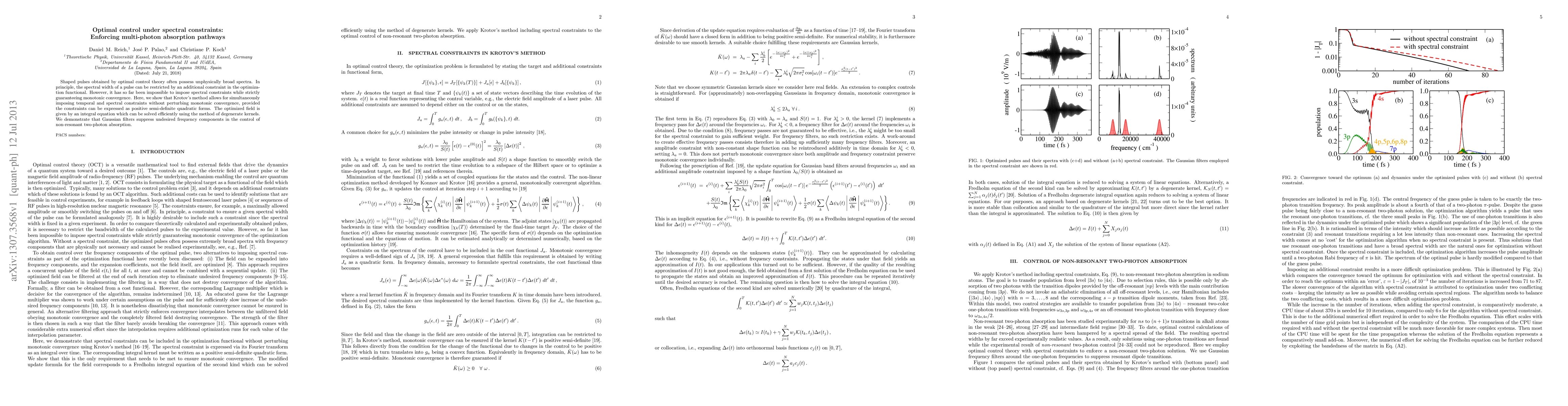 This paper demonstrates that Krotov's method can enforce spectral constraints in optimal control without disrupting monotonic convergence, allowing for shaped pulses with restricted spectral widths. Gaussian filters effectively suppress unwanted frequency components in controlling non-resonant two-photon absorption.