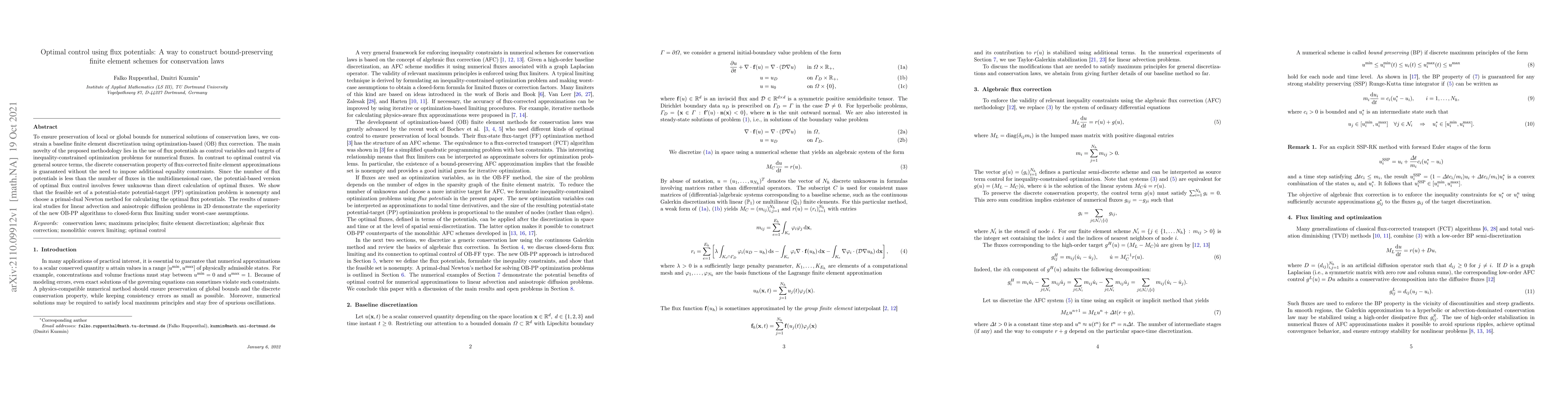This paper proposes a novel optimization-based method for constructing finite element schemes that preserve bounds in conservation laws, using flux potentials as control variables. The method ensures discrete conservation without additional constraints, demonstrating superior performance over traditional flux limiting in numerical studies.