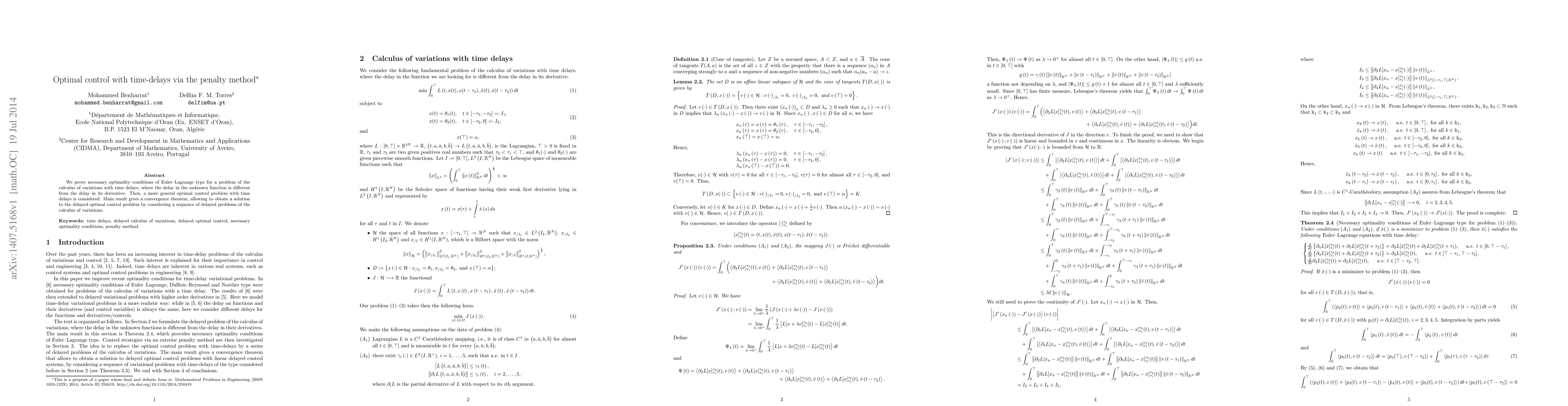 This paper establishes necessary optimality conditions for a calculus of variations problem with time delays, and presents a convergence theorem for solving a general optimal control problem with time delays using a sequence of penalty-based calculus of variations problems.