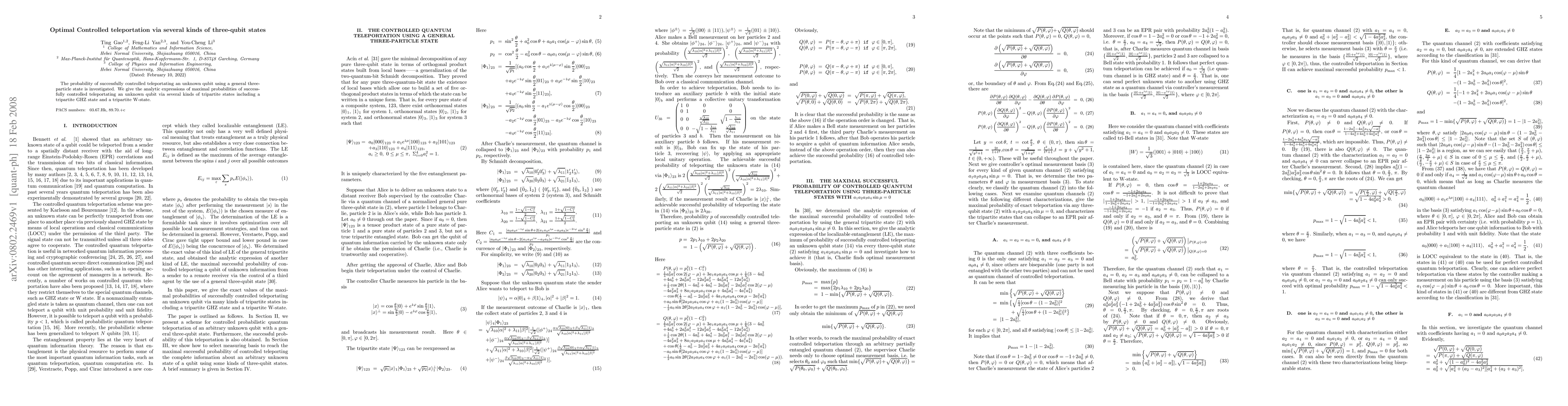 This paper investigates the optimal probabilities for controlled teleportation of an unknown qubit using various three-qubit states, deriving analytic expressions for the maximal success rates for both GHZ and W-state tripartite configurations.