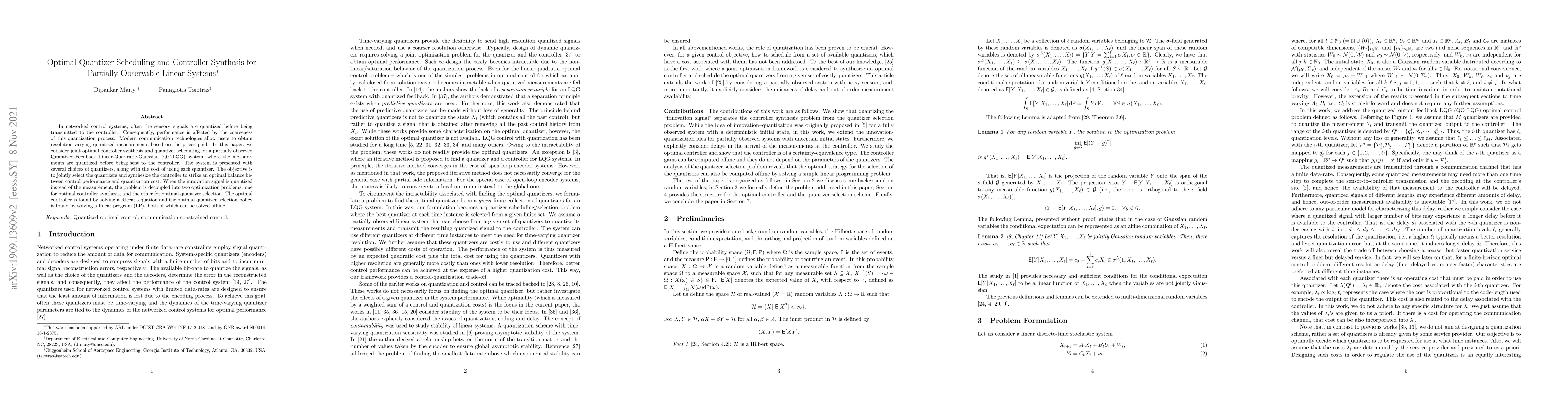 In networked control systems, often the sensory signals are quantized before being transmitted to the controller. Consequently, performance is affected by the coarseness of this quantization process. Modern communication technologies allow users to obtain resolution-varying quantized measurements based on the prices paid. In this paper, we consider joint optimal controller synthesis and quantizer scheduling for a partially observed Quantized-Feedback Linear-Quadratic-Gaussian (QF-LQG) system, where the measurements are quantized before being sent to the controller. The system is presented with several choices of quantizers, along with the cost of using each quantizer. The objective is to jointly select the quantizers and synthesize the controller to strike an optimal balance between control performance and quantization cost. When the innovation signal is quantized instead of the measurement, the problem is decoupled into two optimization problems: one for optimal controller synthesis, and the other for optimal quantizer selection. The optimal controller is found by solving a Riccati equation and the optimal quantizer selection policy is found by solving a linear program (LP)- both of which can be solved offline.