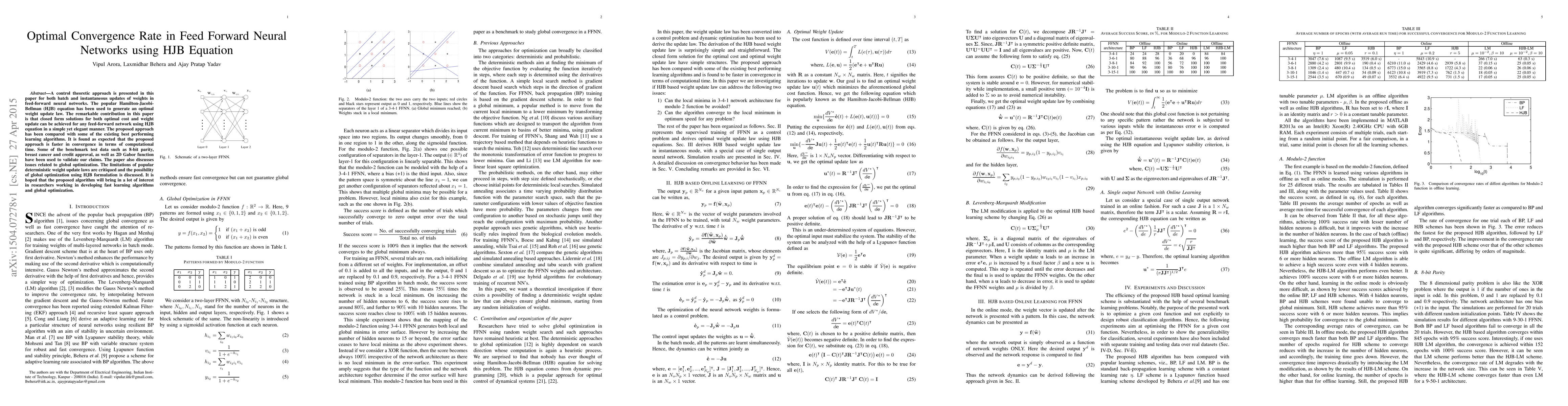 A control theoretic approach using Hamilton-Jacobi-Bellman (HJB) equation achieves optimal weight update for feed-forward neural networks with closed-form solutions, outperforming existing learning algorithms in terms of computational time.