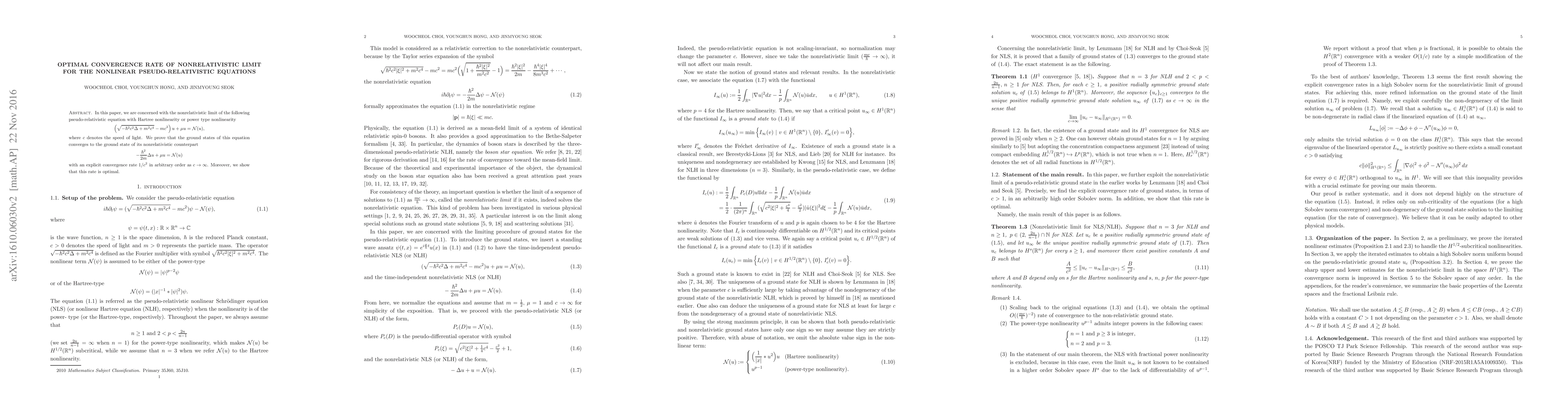 This paper investigates the nonrelativistic limit of a pseudo-relativistic equation with Hartree or power type nonlinearity, proving that the ground states converge to those of the nonrelativistic counterpart with an optimal convergence rate of $1/c^2$ as the speed of light $c$ tends to infinity.