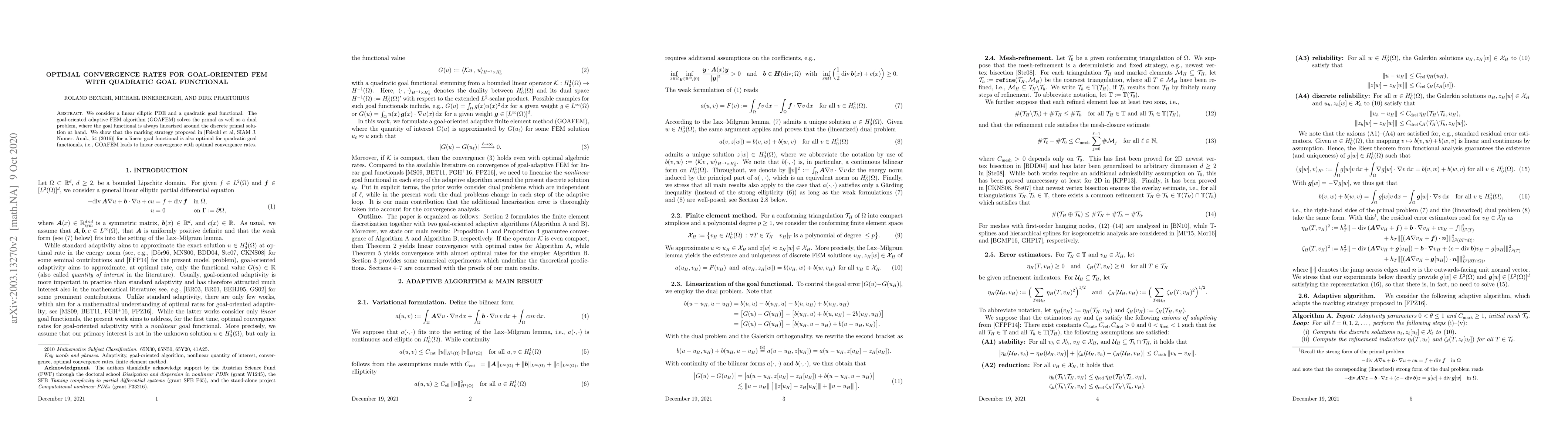 We consider a linear elliptic PDE and a quadratic goal functional. The goal-oriented adaptive FEM algorithm (GOAFEM) solves the primal as well as a dual problem, where the goal functional is always linearized around the discrete primal solution at hand. We show that the marking strategy proposed in [Feischl et al, SIAM J. Numer. Anal., 54 (2016)] for a linear goal functional is also optimal for quadratic goal functionals, i.e., GOAFEM leads to linear convergence with optimal convergence rates.