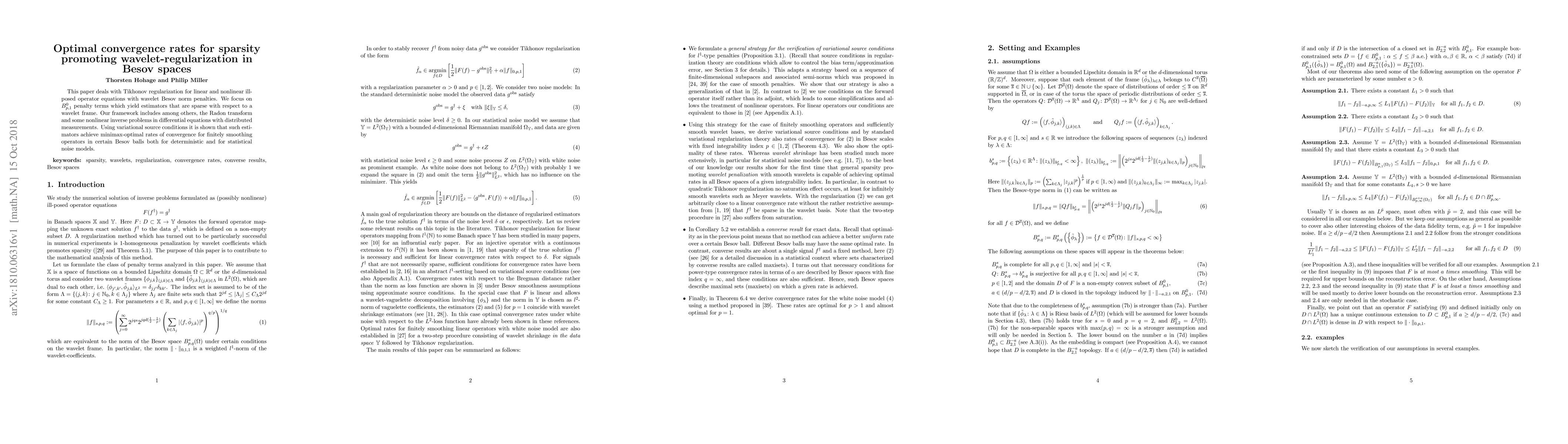 This paper explores Tikhonov regularization with wavelet Besov norm penalties for solving ill-posed operator equations, achieving minimax-optimal convergence rates for sparse estimators in $B^0_{p,1}$ spaces, applicable to linear and nonlinear problems including the Radon transform and nonlinear inverse problems in differential equations.