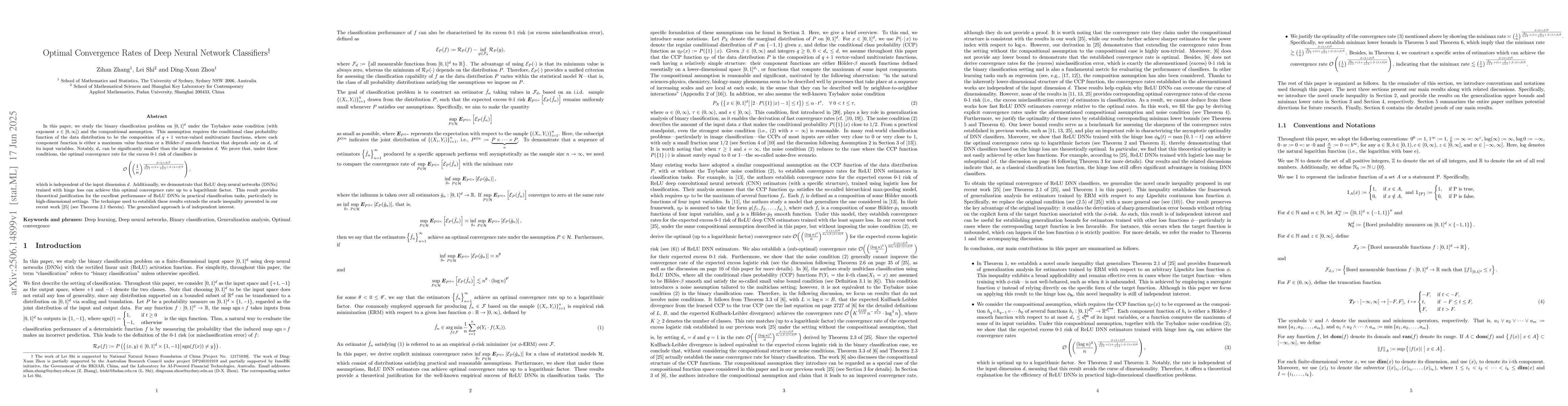 In this paper, we study the binary classification problem on $[0,1]^d$ under the Tsybakov noise condition (with exponent $s \in [0,\infty]$) and the compositional assumption. This assumption requires the conditional class probability function of the data distribution to be the composition of $q+1$ vector-valued multivariate functions, where each component function is either a maximum value function or a H\"{o}lder-$\beta$ smooth function that depends only on $d_*$ of its input variables. Notably, $d_*$ can be significantly smaller than the input dimension $d$. We prove that, under these conditions, the optimal convergence rate for the excess 0-1 risk of classifiers is $$ \left( \frac{1}{n} \right)^{\frac{\beta\cdot(1\wedge\beta)^q}{{\frac{d_*}{s+1}+(1+\frac{1}{s+1})\cdot\beta\cdot(1\wedge\beta)^q}}}\;\;\;, $$ which is independent of the input dimension $d$. Additionally, we demonstrate that ReLU deep neural networks (DNNs) trained with hinge loss can achieve this optimal convergence rate up to a logarithmic factor. This result provides theoretical justification for the excellent performance of ReLU DNNs in practical classification tasks, particularly in high-dimensional settings. The technique used to establish these results extends the oracle inequality presented in our previous work. The generalized approach is of independent interest.