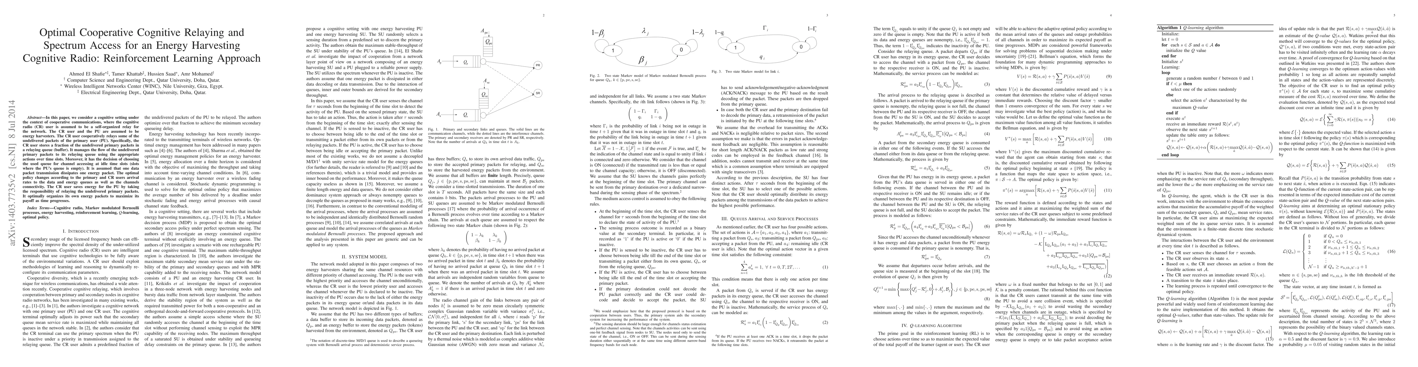 This paper explores optimal cooperative cognitive relaying and spectrum access for an energy harvesting cognitive radio using reinforcement learning. The cognitive radio acts as a relay for undelivered packets from the primary user, optimizing its energy usage and maximizing its payoff over time.