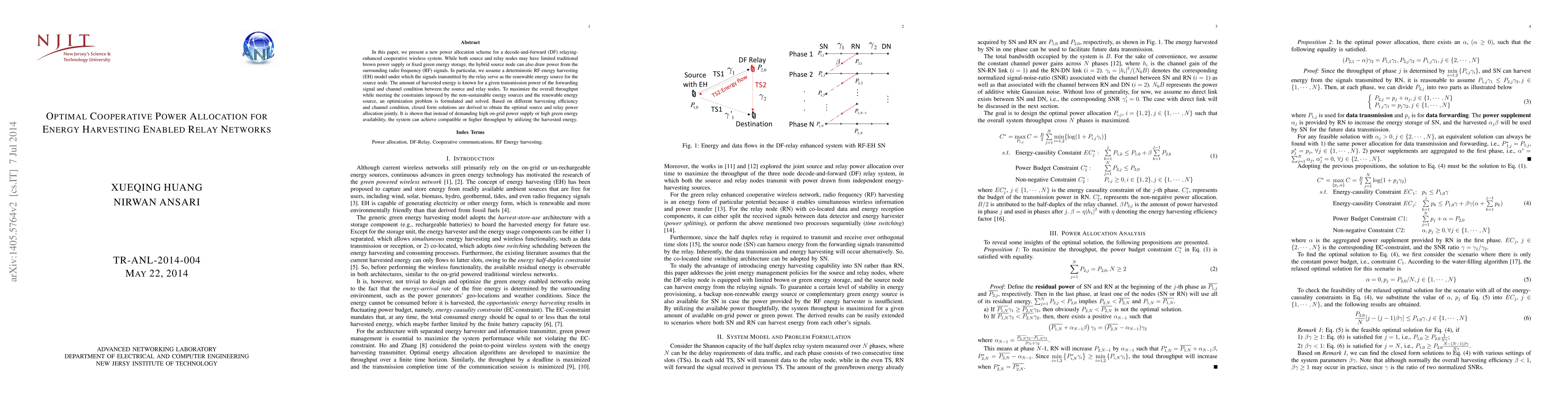 This paper proposes a power allocation scheme for a cooperative wireless system where the source node harvests energy from RF signals transmitted by the relay. The goal is to maximize throughput while considering constraints from limited traditional power and renewable energy, leading to optimal source and relay power allocation solutions.