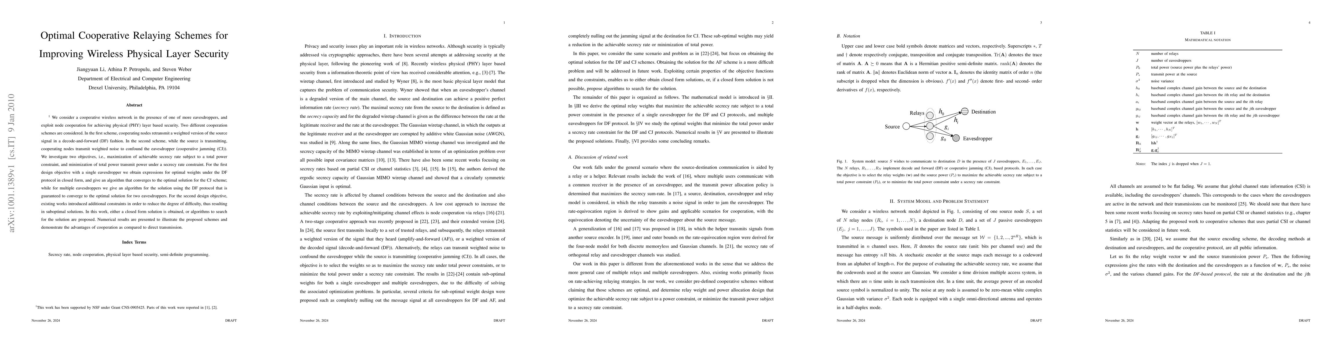 This paper explores optimal cooperative relaying schemes for enhancing security in wireless networks with eavesdroppers. It proposes two schemes: weighted decode-and-forward relaying and cooperative jamming, and develops algorithms for maximizing secrecy rates and minimizing power consumption under various constraints. Numerical results show the benefits of cooperative strategies over direct transmission.