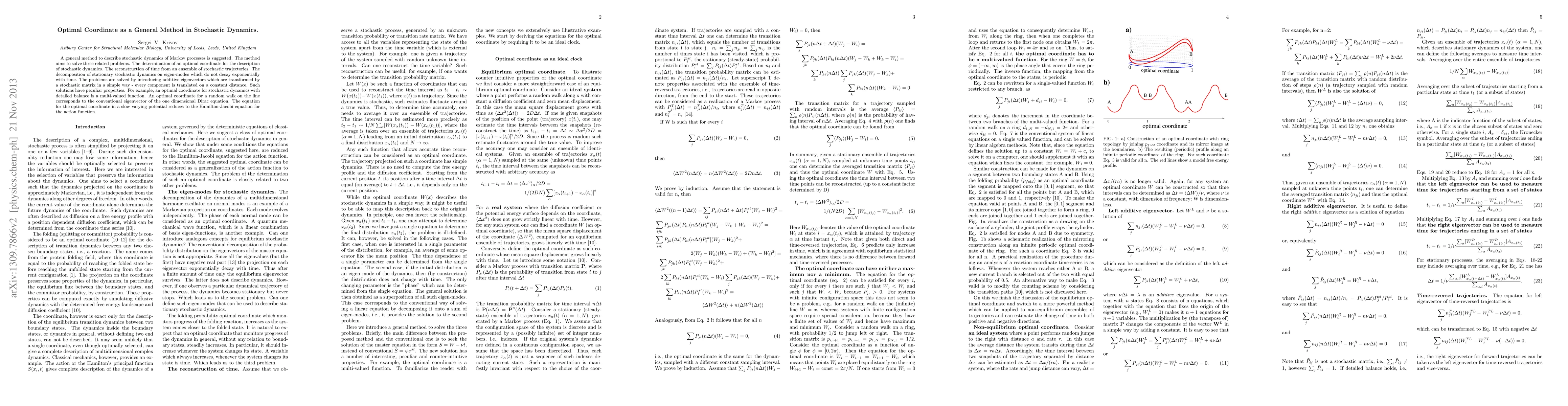 A general method to describe stochastic dynamics of Markov processes is suggested. The method aims to solve three related problems. The determination of an optimal coordinate for the description of stochastic dynamics. The reconstruction of time from an ensemble of stochastic trajectories. The decomposition of stationary stochastic dynamics on eigen-modes which do not decay exponentially with time. The problems are solved by introducing additive eigenvectors which are transformed by a stochastic matrix in a simple way - every component is translated on a constant distance. Such solutions have peculiar properties. For example, an optimal coordinate for stochastic dynamics with detailed balance is a multi-valued function. An optimal coordinate for a random walk on the line corresponds to the conventional eigenvector of the one dimensional Dirac equation. The equation for the optimal coordinate in a slow varying potential reduces to the Hamilton-Jacobi equation for the action function.