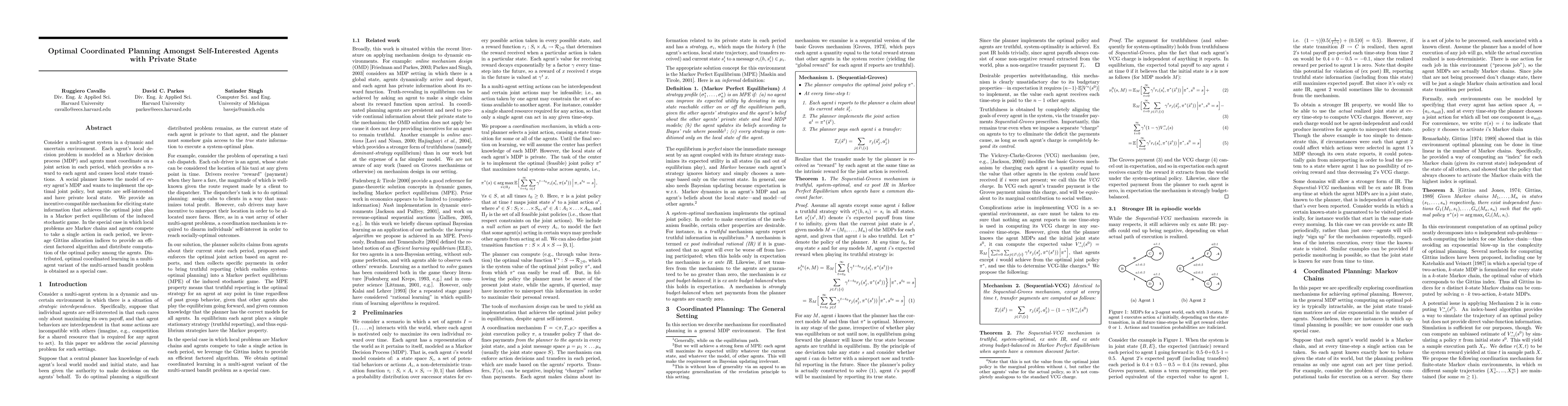 Consider a multi-agent system in a dynamic and uncertain environment. Each agent's local decision problem is modeled as a Markov decision process (MDP) and agents must coordinate on a joint action in each period, which provides a reward to each agent and causes local state transitions. A social planner knows the model of every agent's MDP and wants to implement the optimal joint policy, but agents are self-interested and have private local state. We provide an incentive-compatible mechanism for eliciting state information that achieves the optimal joint plan in a Markov perfect equilibrium of the induced stochastic game. In the special case in which local problems are Markov chains and agents compete to take a single action in each period, we leverage Gittins allocation indices to provide an efficient factored algorithm and distribute computation of the optimal policy among the agents. Distributed, optimal coordinated learning in a multi-agent variant of the multi-armed bandit problem is obtained as a special case.
