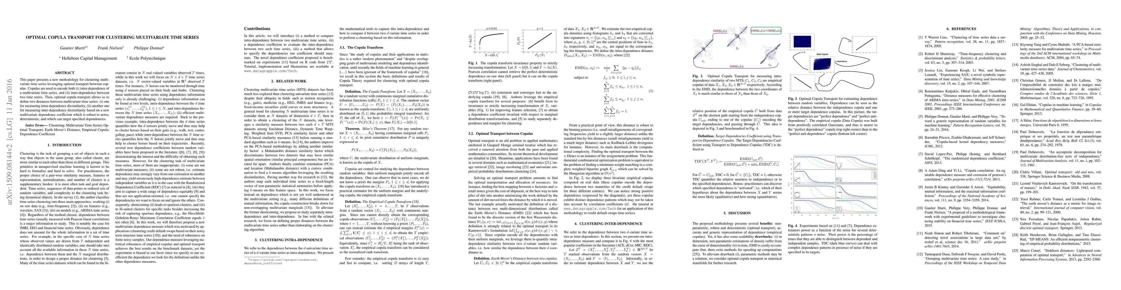 The paper's main technical contribution is the development of optimal copula transport for clustering multivariate time series, along with the introduction of the Earth Mover's Distance between copulas and the Target Dependencies Coefficient.