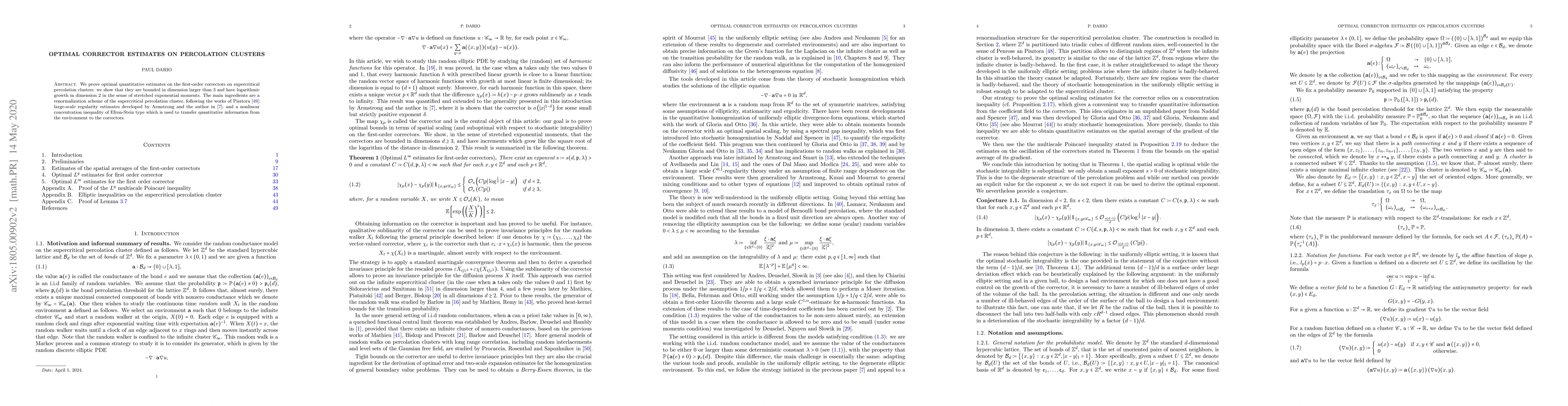 This research establishes optimal bounds for first-order corrector estimates on supercritical percolation clusters, demonstrating boundedness in dimensions three and higher, and logarithmic growth akin to stretched exponential moments in two dimensions. The methodology involves a renormalization scheme, large-scale regularity estimates, and a novel Efron-Stein type concentration inequality to transfer quantitative data from the environment to the correctors.