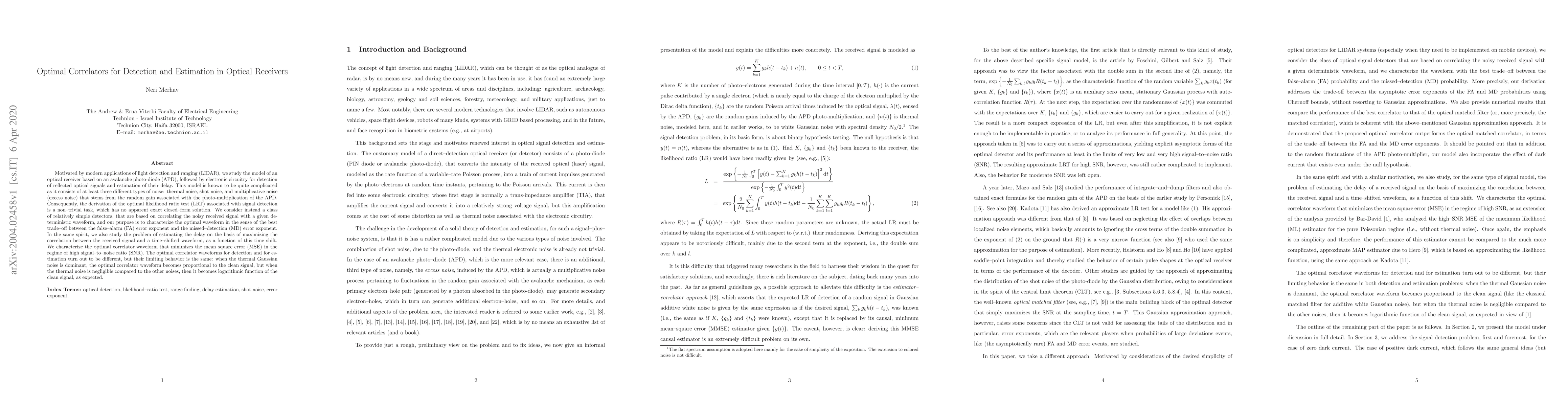 Motivated by modern applications of light detection and ranging (LIDAR), we study the model of an optical receiver based on an avalanche photo-diode (APD), followed by electronic circuitry for detection of reflected optical signals and estimation of their delay.This model is known to be quite complicated as it consists of at least three different types of noise: thermal noise, shot noise, and multiplicative noise (excess noise) that stems from the random gain associated with the photo-multiplication of the APD. Consequently, the derivation of the optimal likelihood ratio test (LRT) associated with signal detection is a non-trivial task, which has no apparent exact closed--form solution. We consider instead a class of relatively simple detectors, that are based on correlating the noisy received signal with a given deterministic waveform, and our purpose is to characterize the optimal waveform in the sense of the best trade--off between the false-alarm (FA) error exponent and the missed-detection (MD) error exponent. In the same spirit, we also study the problem of estimating the delay on the basis of maximizing the correlation between the received signal and a time-shifted waveform, as a function of this time shift. We characterize the optimal correlator waveform that minimizes the mean square error (MSE) in the regime of high signal-to-noise ratio (SNR). The optimal correlator waveforms for detection and for estimation turn out to be different, but their limiting behavior is the same: when the thermal Gaussian noise is dominant, the optimal correlator waveform becomes proportional to the clean signal, but when the thermal noise is negligible compared to the other noises, then it becomes logarithmic function of the clean signal, as expected.