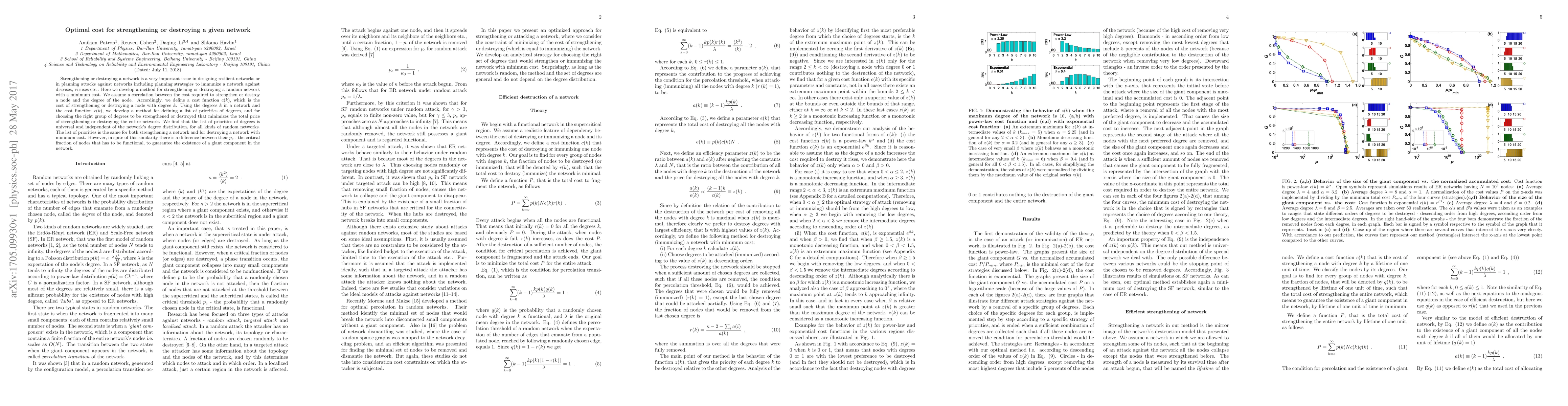 Strengthening or destroying a network is a very important issue in designing resilient networks or in planning attacks against networks including planning strategies to immunize a network against diseases, viruses etc.. Here we develop a method for strengthening or destroying a random network with a minimum cost. We assume a correlation between the cost required to strengthen or destroy a node and the degree of the node. Accordingly, we define a cost function c(k), which is the cost of strengthening or destroying a node with degree k. Using the degrees $k$ in a network and the cost function c(k), we develop a method for defining a list of priorities of degrees, and for choosing the right group of degrees to be strengthened or destroyed that minimizes the total price of strengthening or destroying the entire network. We find that the list of priorities of degrees is universal and independent of the network's degree distribution, for all kinds of random networks. The list of priorities is the same for both strengthening a network and for destroying a network with minimum cost. However, in spite of this similarity there is a difference between their p_c - the critical fraction of nodes that has to be functional, to guarantee the existence of a giant component in the network.