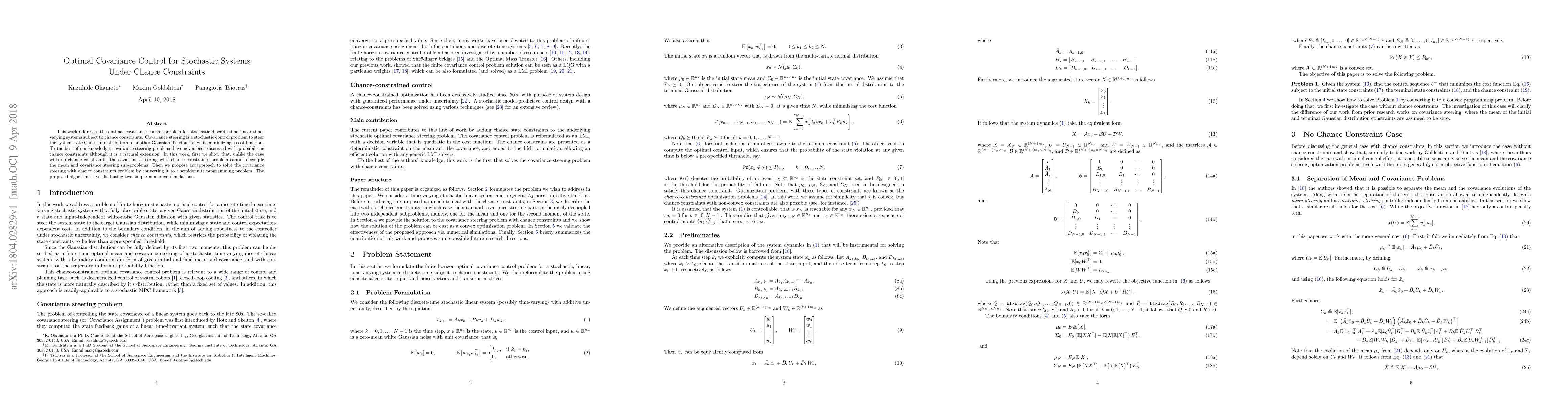 This paper tackles optimal covariance control for stochastic systems under chance constraints, demonstrating that mean and covariance steering cannot be decoupled when constraints are present. It proposes an algorithm converting the problem into a semidefinite programming problem, validated through numerical simulations.
