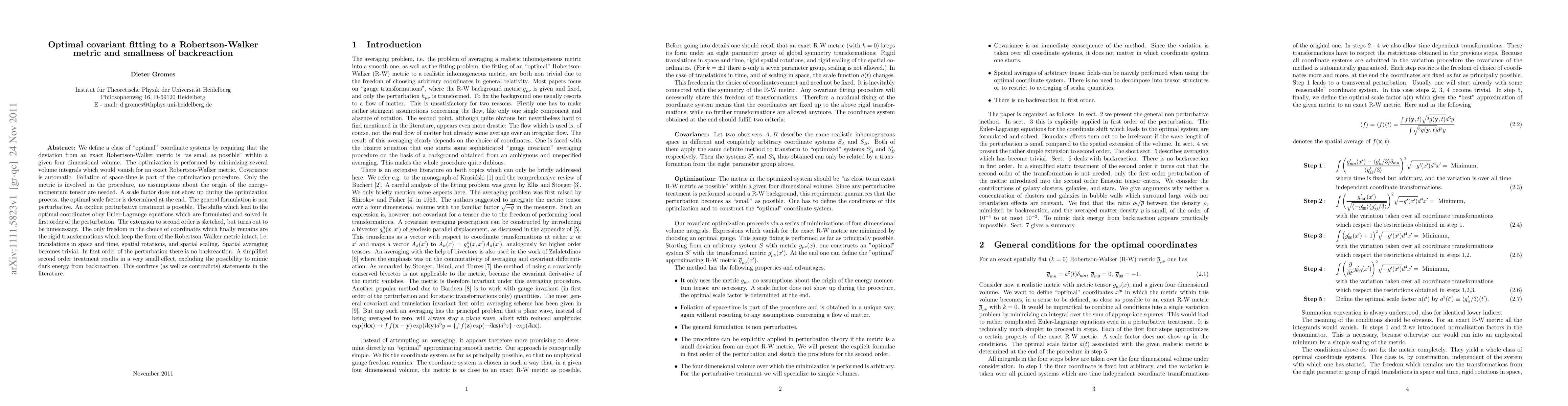 We define a class of "optimal" coordinate systems by requiring that the deviation from an exact Robertson-Walker metric is "as small as possible" within a given four dimensional volume. The optimization is performed by minimizing several volume integrals which would vanish for an exact Robertson-Walker metric. Covariance is automatic. Foliation of space-time is part of the optimization procedure. Only the metric is involved in the procedure, no assumptions about the origin of the energy-momentum tensor are needed. A scale factor does not show up during the optimization process, the optimal scale factor is determined at the end. The general formulation is non perturbative. An explicit perturbative treatment is possible. The shifts which lead to the optimal coordinates obey Euler-Lagrange equations which are formulated and solved in first order of the perturbation. The extension to second order is sketched, but turns out to be unnecessary. The only freedom in the choice of coordinates which finally remains are the rigid transformations which keep the form of the Robertson-Walker metric intact, i.e. translations in space and time, spatial rotations, and spatial scaling. Spatial averaging becomes trivial. In first order of the perturbation there is no backreaction. A simplified second order treatment results in a very small effect, excluding the possibility to mimic dark energy from backreaction. This confirms (as well as contradicts) statements in the literature.
