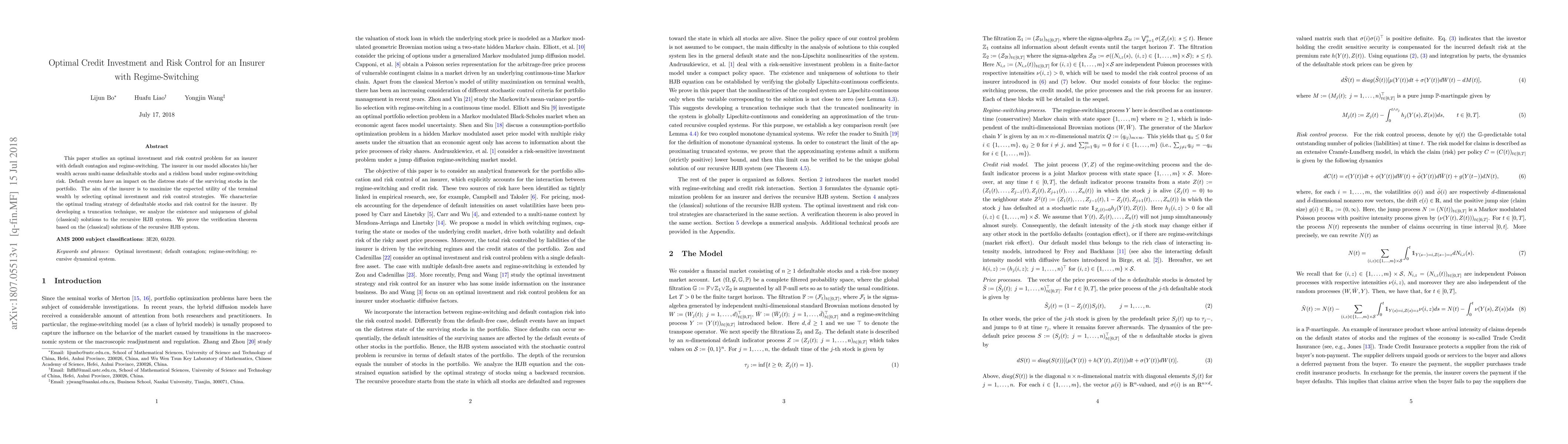 This paper investigates optimal investment and risk control strategies for an insurer managing default contagion and regime-switching risks. It characterizes the best trading and risk control strategies to maximize terminal wealth utility, proving the existence and uniqueness of solutions to the recursive HJB system and verifying the theorem with classical solutions.