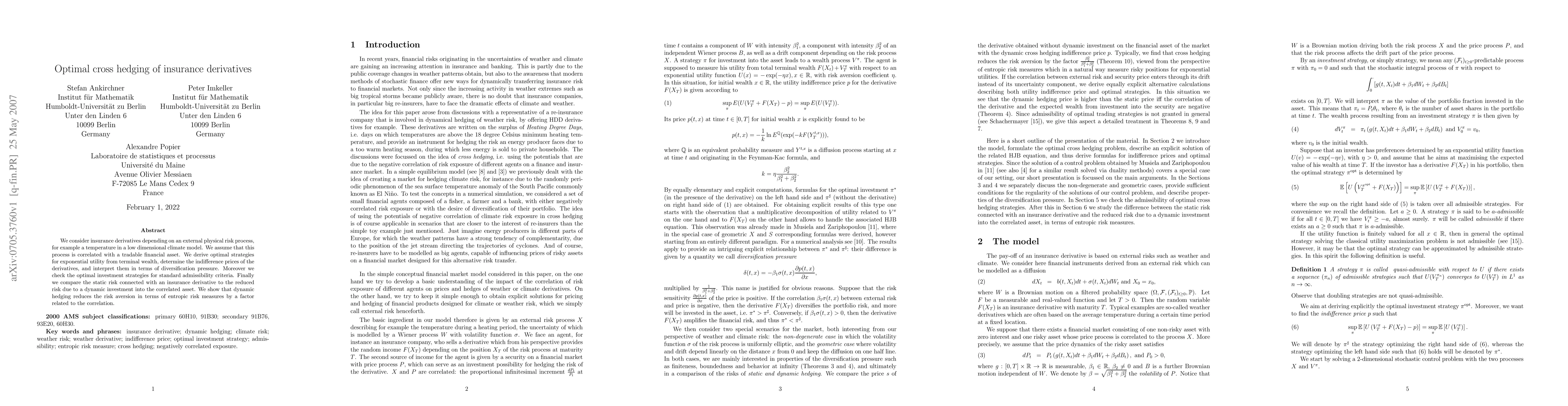 This paper develops optimal strategies for hedging insurance derivatives linked to physical risk processes, such as temperature, using a correlated financial asset. It determines the optimal dynamic hedging strategies and evaluates their impact on reducing risk through diversification, showing that dynamic hedging reduces risk aversion significantly based on entropic measures.