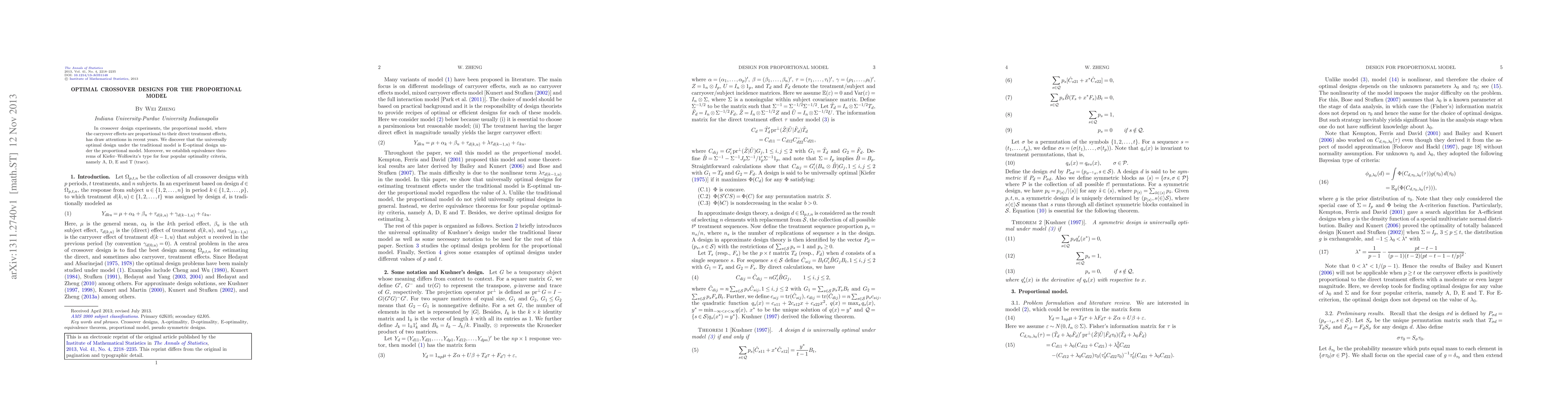 This paper investigates optimal crossover designs under the proportional model, finding that E-optimal designs are universally optimal. It also establishes equivalence theorems for A, D, E, and T optimality criteria under this model.