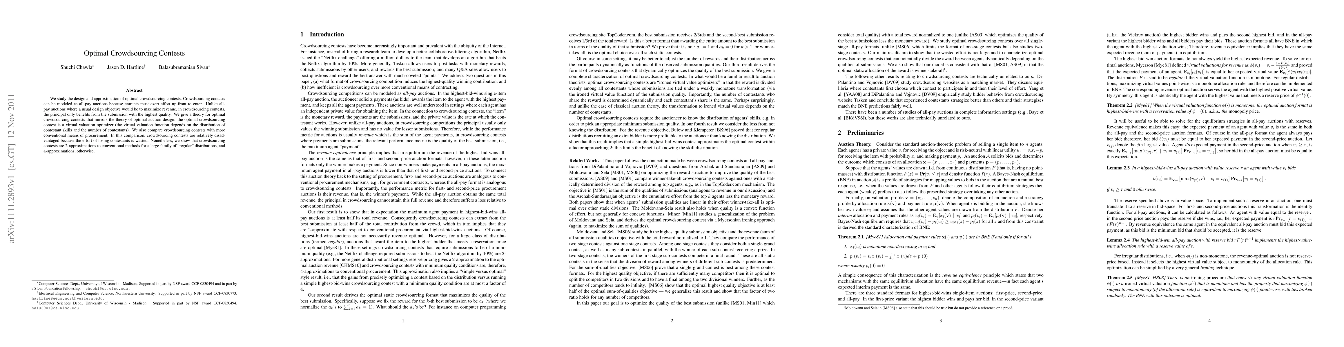 This paper develops a theory for optimal crowdsourcing contests, comparing them to conventional procurement methods, and finds that while losing contestants' effort is wasted, crowdsourcing contests provide a 2-approximation to optimal methods under regular distributions and a 4-approximation otherwise.