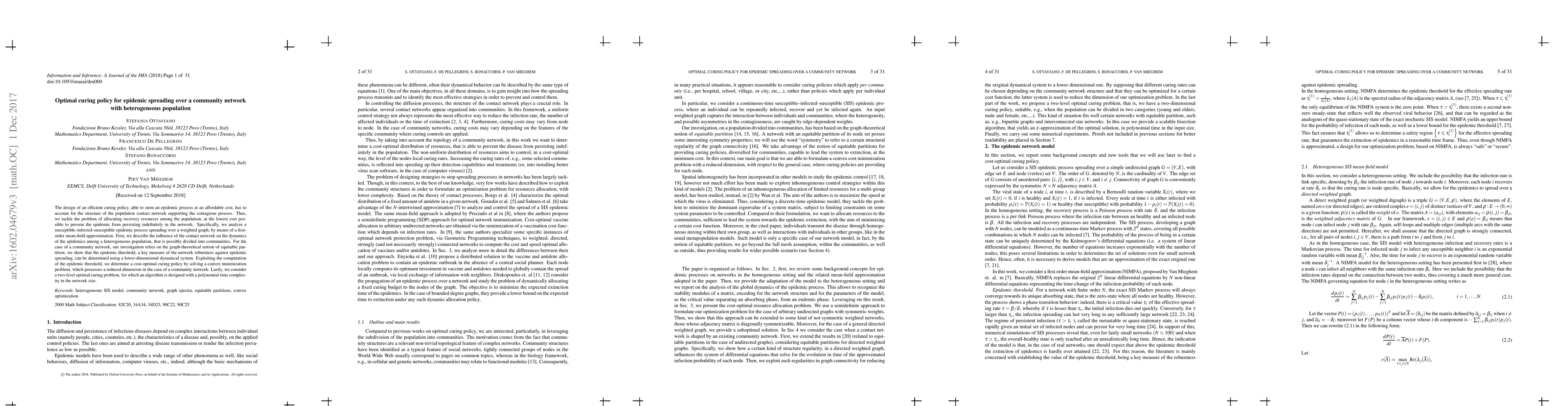 The design of an efficient curing policy, able to stem an epidemic process at an affordable cost, has to account for the structure of the population contact network supporting the contagious process. Thus, we tackle the problem of allocating recovery resources among the population, at the lowest cost possible to prevent the epidemic from persisting indefinitely in the network. Specifically, we analyze a susceptible-infected-susceptible epidemic process spreading over a weighted graph, by means of a first-order mean-field approximation. First, we describe the influence of the contact network on the dynamics of the epidemics among a heterogeneous population, that is possibly divided into communities. For the case of a community network, our investigation relies on the graph-theoretical notion of equitable partition; we show that the epidemic threshold, a key measure of the network robustness against epidemic spreading, can be determined using a lower-dimensional dynamical system. Exploiting the computation of the epidemic threshold, we determine a cost-optimal curing policy by solving a convex minimization problem, which possesses a reduced dimension in the case of a community network. Lastly, we consider a two-level optimal curing problem, for which an algorithm is designed with a polynomial time complexity in the network size.