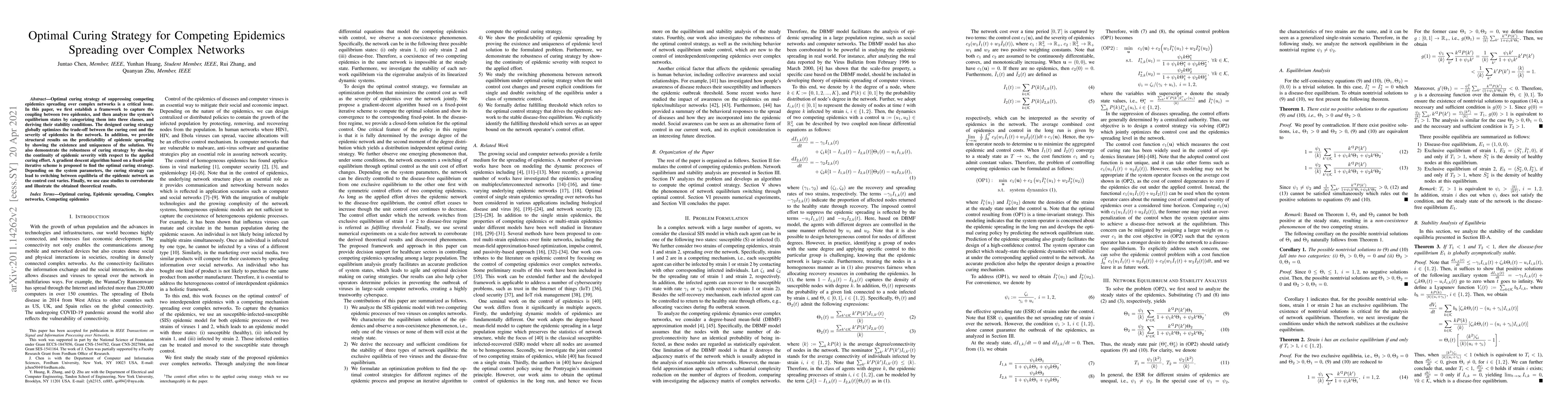 This paper develops a framework to optimize the curing strategy for competing epidemics on complex networks, analyzing the system's equilibrium states and stability conditions. It proposes a gradient descent algorithm to find the optimal strategy, demonstrating its robustness and effectiveness through theoretical analysis and case studies.