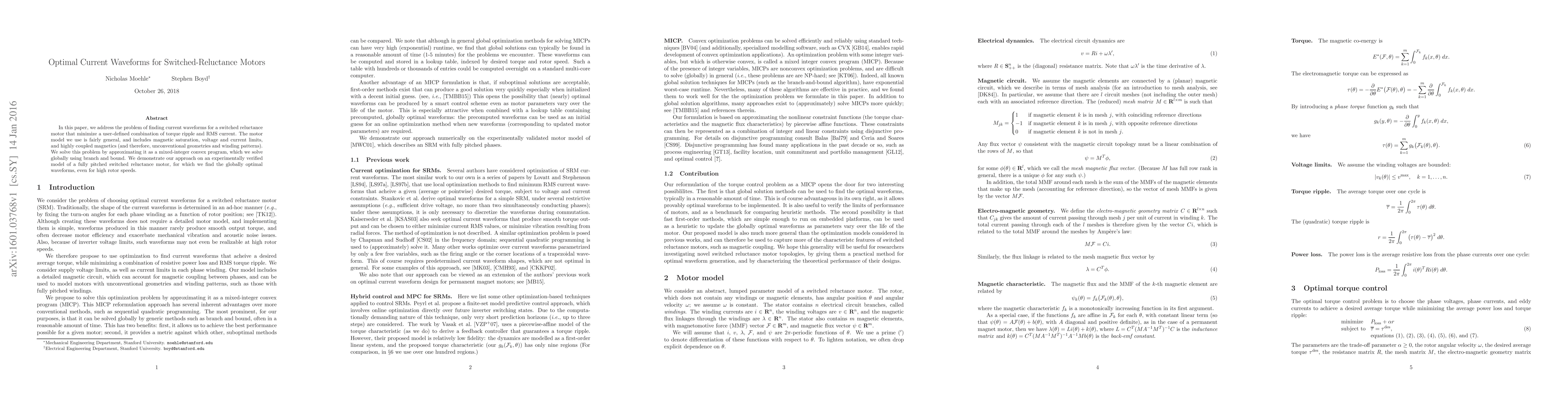 This paper proposes a mixed-integer convex program to determine optimal current waveforms for switched-reluctance motors that minimize torque ripple and RMS current, considering magnetic saturation and complex geometries. The approach is globally solved using branch and bound, validated through an experimentally verified motor model.