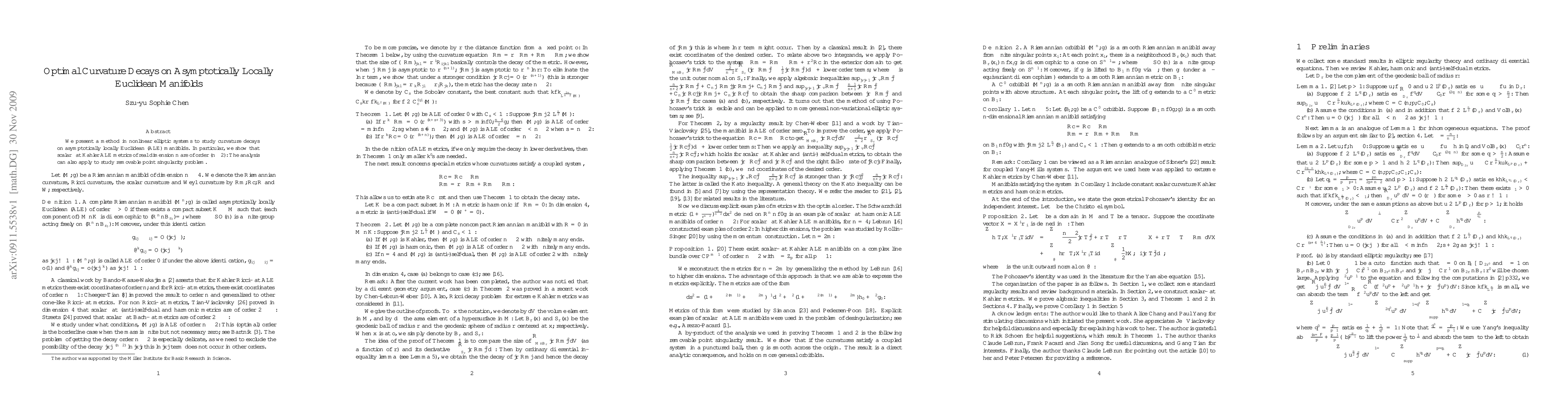 We present a method in nonlinear elliptic systems to study curvature decays on asymptotically locally Euclidean (ALE) manifolds. In particular, we show that scalar flat Kahler and harmonic ALE metrics of real dimension n are of order n-2.