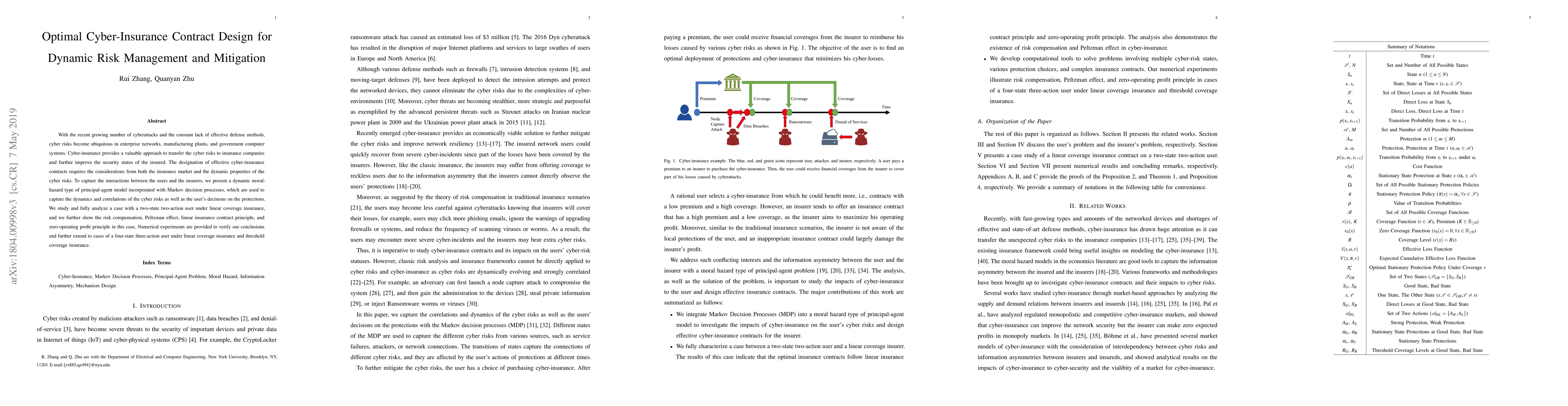With the recent growing number of cyberattacks and the constant lack of effective defense methods, cyber risks become ubiquitous in enterprise networks, manufacturing plants, and government computer systems. Cyber-insurance provides a valuable approach to transfer the cyber risks to insurance companies and further improve the security status of the insured. The designation of effective cyber-insurance contracts requires the considerations from both the insurance market and the dynamic properties of the cyber risks. To capture the interactions between the users and the insurers, we present a dynamic moral-hazard type of principal-agent model incorporated with Markov decision processes, which are used to capture the dynamics and correlations of the cyber risks as well as the user's decisions on the protections. We study and fully analyze a case with a two-state two-action user under linear coverage insurance, and we further show the risk compensation, Peltzman effect, linear insurance contract principle, and zero-operating profit principle in this case. Numerical experiments are provided to verify our conclusions and further extend to cases of a four-state three-action user under linear coverage insurance and threshold coverage insurance.