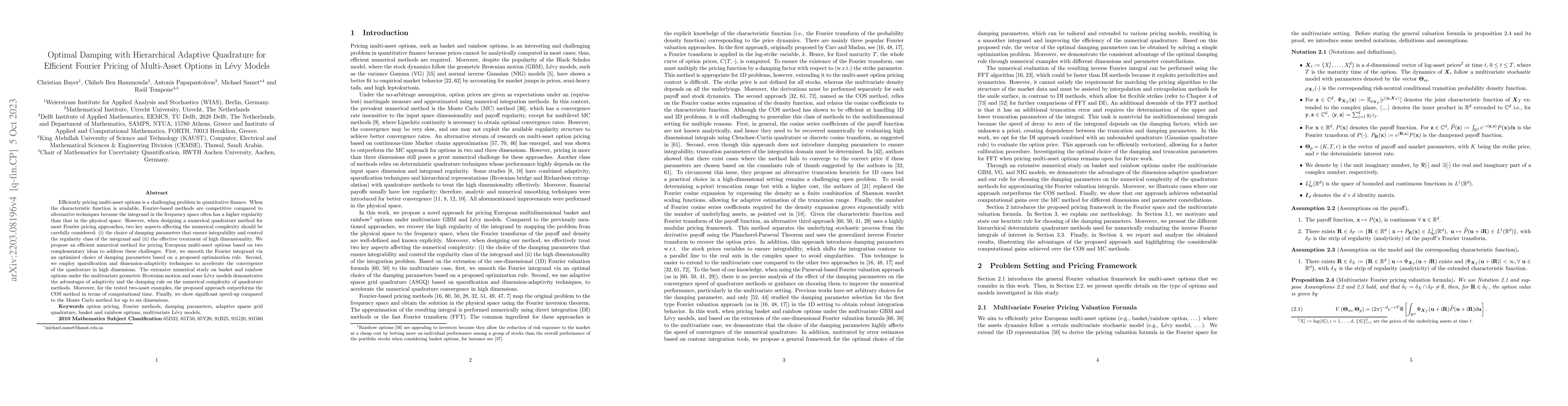 This paper proposes an efficient numerical method for pricing multi-asset options using Fourier transforms, focusing on optimal damping and hierarchical adaptive quadrature to manage high dimensionality and improve convergence. The method outperforms traditional COS and Monte Carlo methods in computational efficiency.