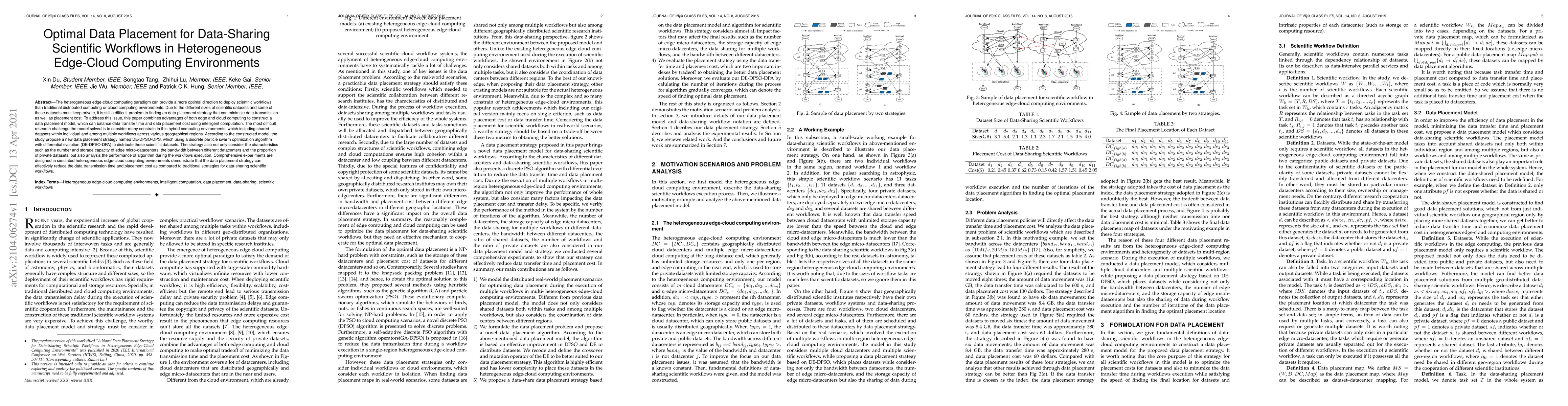 This paper proposes a new data placement strategy, DE-DPSO-DPS, to optimally distribute scientific datasets in heterogeneous edge-cloud environments, minimizing data transmission time and placement cost through a hybrid model combining edge and cloud computing. Experimental results show significant improvements over traditional strategies.