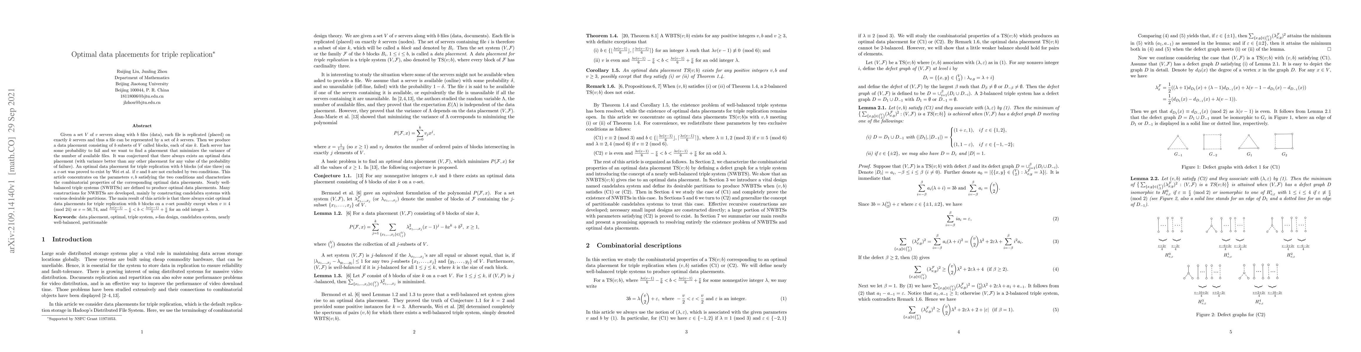 Researchers investigate optimal data placement strategies for triple replication to minimize variance in file availability, finding that such placements exist for most parameter combinations except specific cases where v is congruent to 4 modulo 24 or v equals 50, 74.