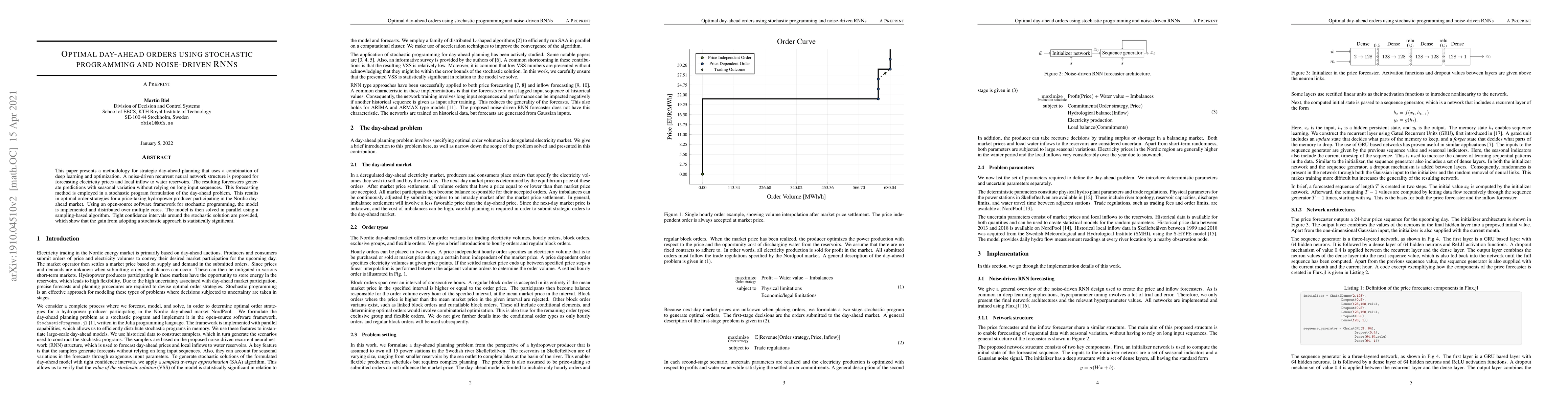 This paper proposes a new method for forecasting electricity prices and water reservoir levels using noise-driven RNNs and stochastic programming, enabling optimal day-ahead orders for hydropower producers. The model provides statistically significant gains through tight confidence intervals.