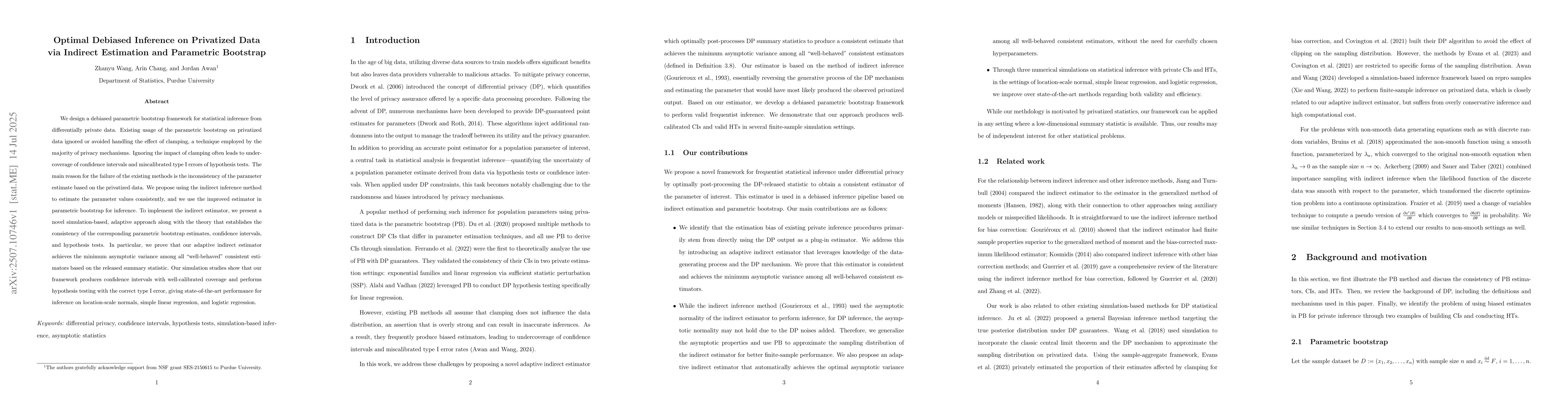 We design a debiased parametric bootstrap framework for statistical inference from differentially private data. Existing usage of the parametric bootstrap on privatized data ignored or avoided handling the effect of clamping, a technique employed by the majority of privacy mechanisms. Ignoring the impact of clamping often leads to under-coverage of confidence intervals and miscalibrated type I errors of hypothesis tests. The main reason for the failure of the existing methods is the inconsistency of the parameter estimate based on the privatized data. We propose using the indirect inference method to estimate the parameter values consistently, and we use the improved estimator in parametric bootstrap for inference. To implement the indirect estimator, we present a novel simulation-based, adaptive approach along with the theory that establishes the consistency of the corresponding parametric bootstrap estimates, confidence intervals, and hypothesis tests. In particular, we prove that our adaptive indirect estimator achieves the minimum asymptotic variance among all "well-behaved" consistent estimators based on the released summary statistic. Our simulation studies show that our framework produces confidence intervals with well-calibrated coverage and performs hypothesis testing with the correct type I error, giving state-of-the-art performance for inference on location-scale normals, simple linear regression, and logistic regression.