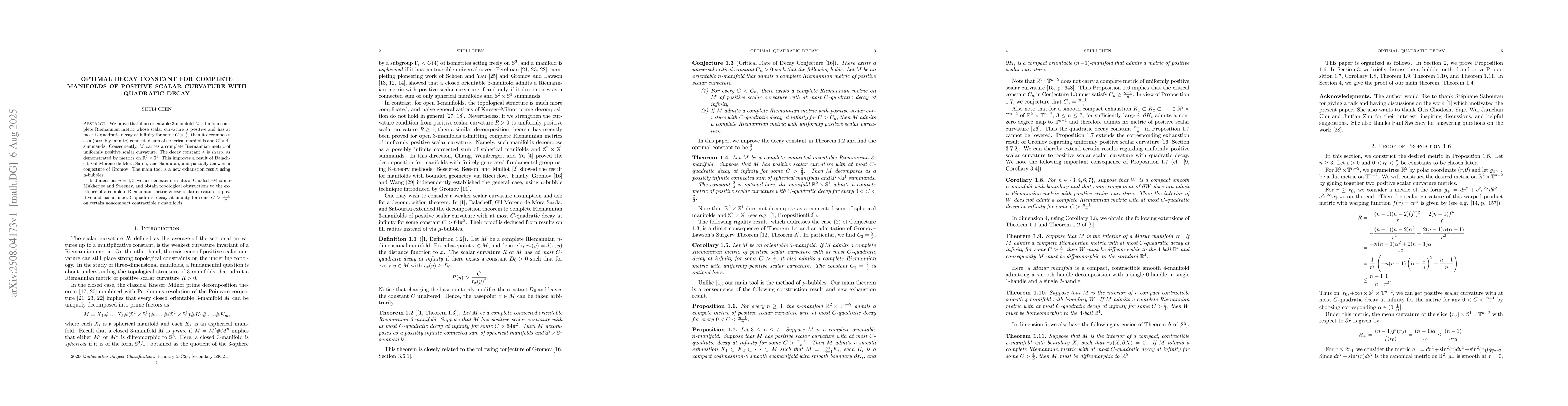 We prove that if an orientable 3-manifold $M$ admits a complete Riemannian metric whose scalar curvature is positive and has at most $C$-quadratic decay at infinity for some $C > \frac{2}{3}$, then it decomposes as a (possibly infinite) connected sum of spherical manifolds and $\mathbb{S}^2\times \mathbb{S}^1$ summands. Consequently, $M$ carries a complete Riemannian metric of uniformly positive scalar curvature. The decay constant $\frac{2}{3}$ is sharp, as demonstrated by metrics on $\mathbb{R}^2 \times \mathbb{S}^1$. This improves a result of Balacheff, Gil Moreno de Mora Sard\`a, and Sabourau, and partially answers a conjecture of Gromov. The main tool is a new exhaustion result using $\mu$-bubbles. In dimensions $n = 4, 5$, we further extend results of Chodosh--Maximo--Mukherjee and Sweeney, and obtain topological obstructions to the existence of a complete Riemannian metric whose scalar curvature is positive and has at most $C$-quadratic decay at infinity for some $C > \frac{n-1}{n}$ on certain noncompact contractible $n$-manifolds.